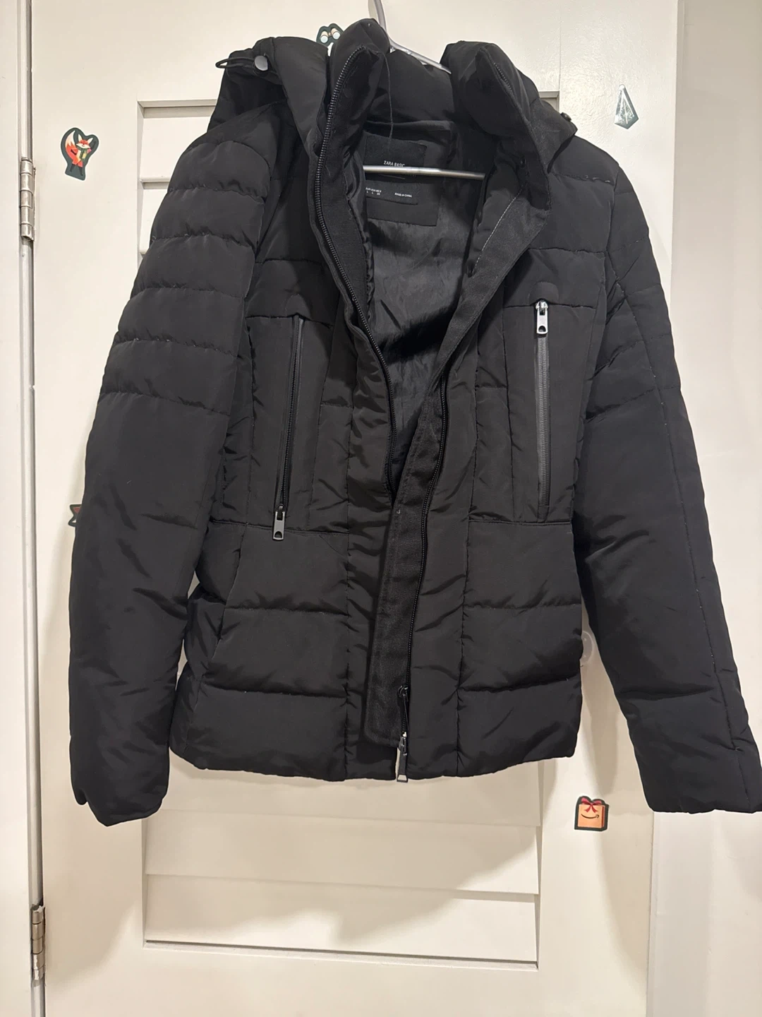 I'm selling a Zara Basic black puffer jacket. It's in great condition and perfect for the colder weather. This stylish jacket will keep you warm and cozy!
