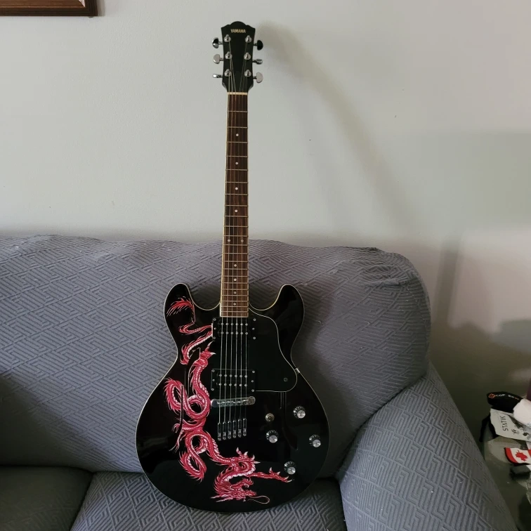 Selling a Yamaha electric guitar that's in great condition! It features a unique dragon design. It's ready to be played and enjoyed by a new owner