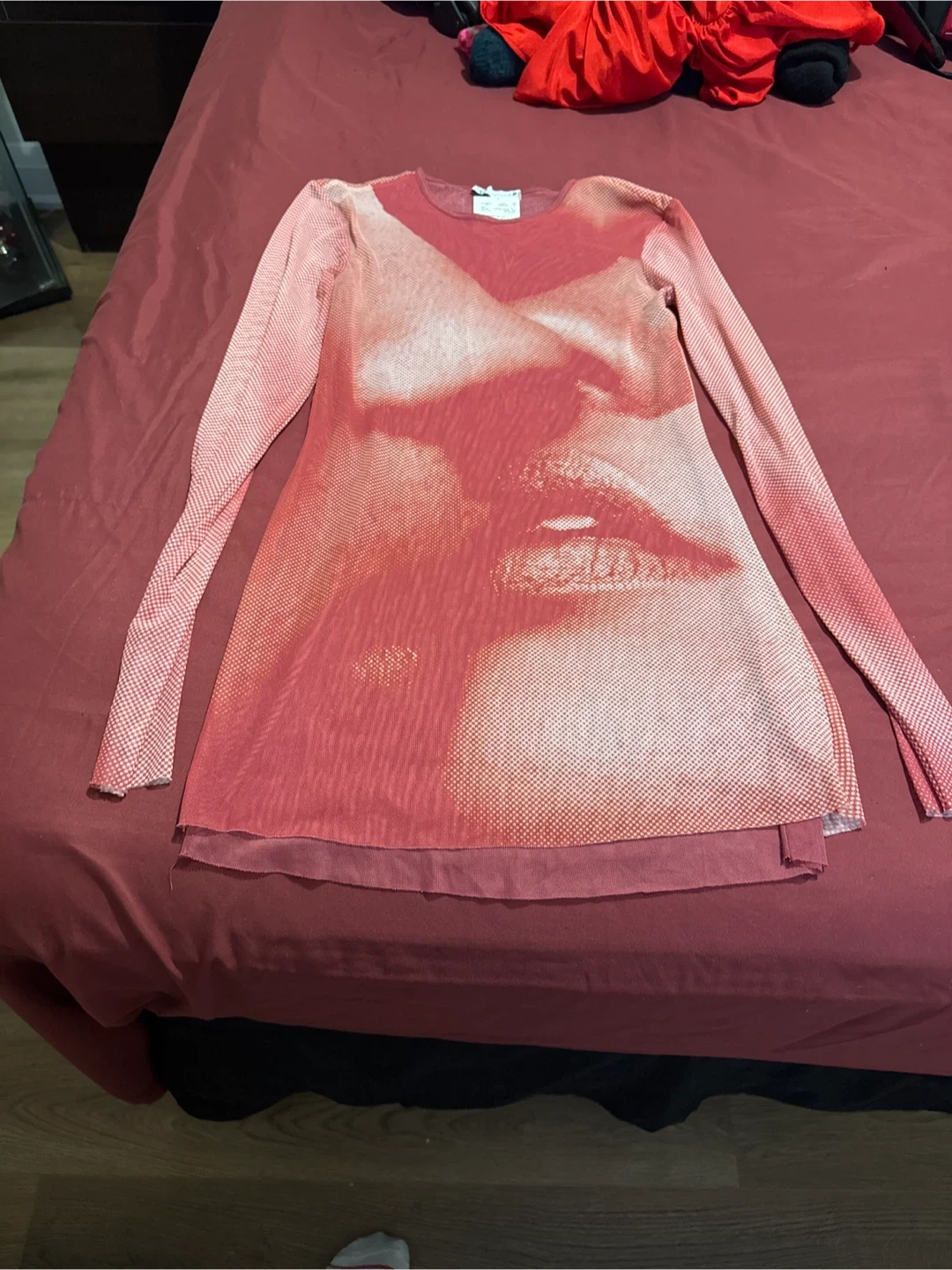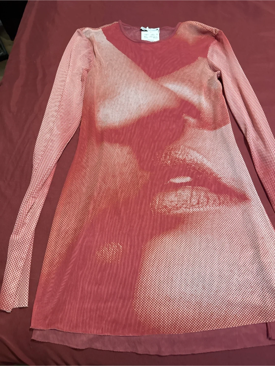 Selling a Zara mesh long sleeve dress. The dress features a unique face print and is a size small. Perfect for a night out or a casual event!