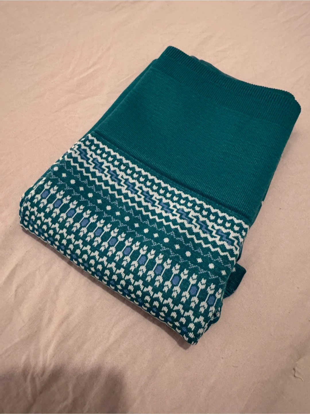 Selling a pair of teal leggings with a cute wintery pattern! They're in great condition and would be perfect for lounging or light exercise.