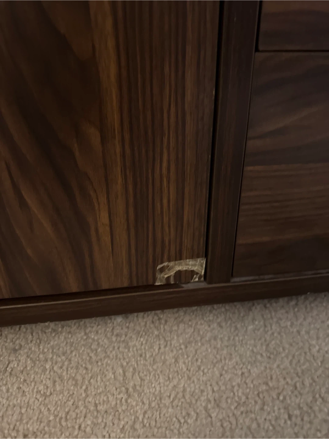 Selling a wood TV stand or entertainment unit. There is some damage on the bottom of one of the doors, as pictured. It's a sturdy piece of furniture that would work great in a living room or rec room