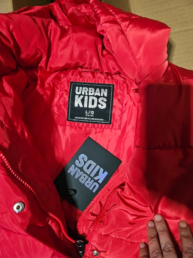 Here's a bright red puffer jacket from Urban Kids, size L (14/16). It’s in great shape and ready to keep someone warm!