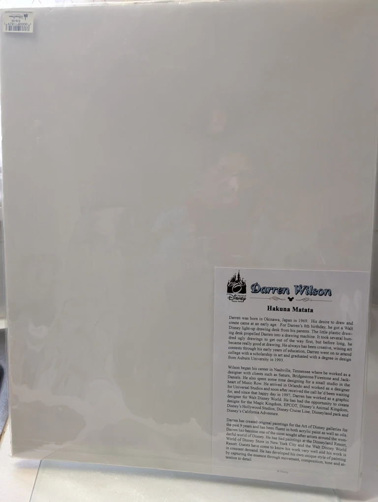 Darren Wilson Hakuna Matata art piece from Disney! This features Simba, Pumbaa, and Timon in a beautiful scene. It's a great addition for any Disney or Lion King fan
