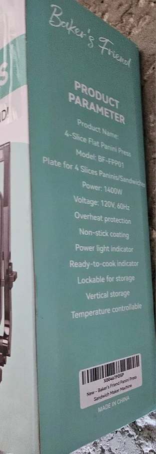 Selling a brand new Baker's Friend 4-Slice Flat Panini Press! Enjoy paninis and sandwiches all year round with this fast-heating and easy-to-use appliance. It features a non-stick surface and can make 4 slices of paninis or sandwiches at once. The panini press also has overheat protection, a power light indicator, and a ready-to-cook indicator. Plus, it's lockable for storage and can be stored vertically. The temperature is also controllable! Box included