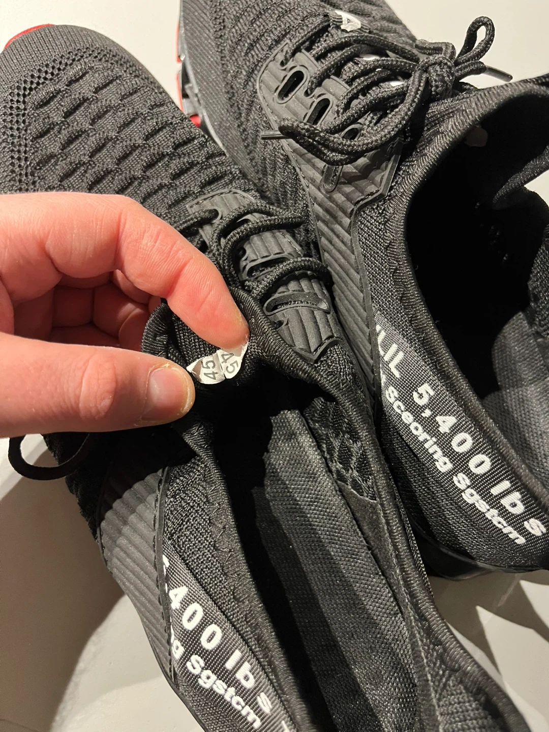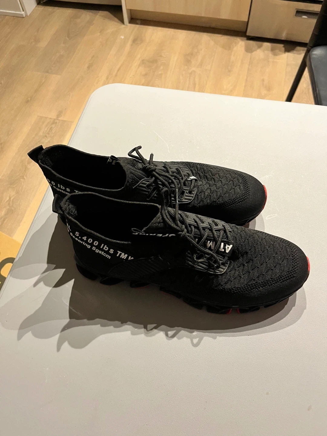 Selling a pair of LUNIVA black running shoes in size 45 European. They feature a unique design with "5,400 lbs” printed on the side. Great for running or casual wear!