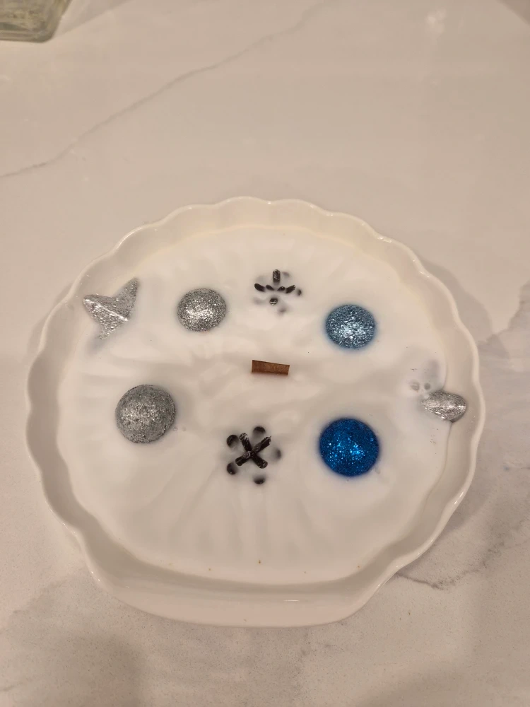 Selling a handmade decorative candle! It features a white base with embedded silver and blue glittery ornaments. A unique addition to any room!
