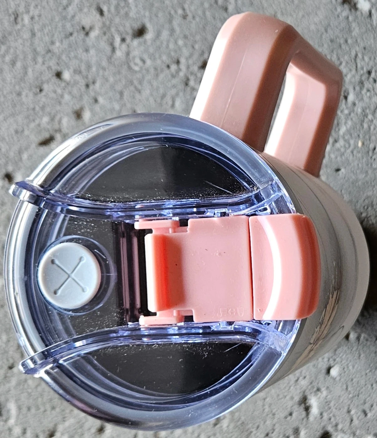 Here's a nice floral print tumbler with a handle! It's in great shape and ready for your favourite beverages. Perfect for keeping drinks hot or cold on the go
