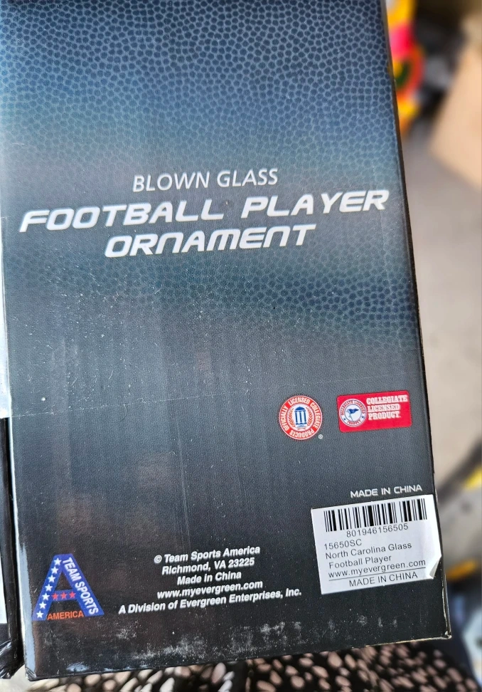 Selling a blown glass football player ornament, featuring the North Carolina Tar Heels logo. It comes in its original box and is in great condition. Perfect for any UNC fan!