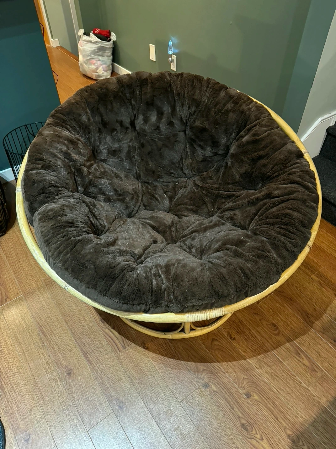 Selling a comfy papasan chair! It's in great shape and perfect for adding a cozy touch to any room. The cushion is a soft brown colour and the frame is sturdy. Its well taken care of. The bottom base comes off the bowl for maximum swivel fun.