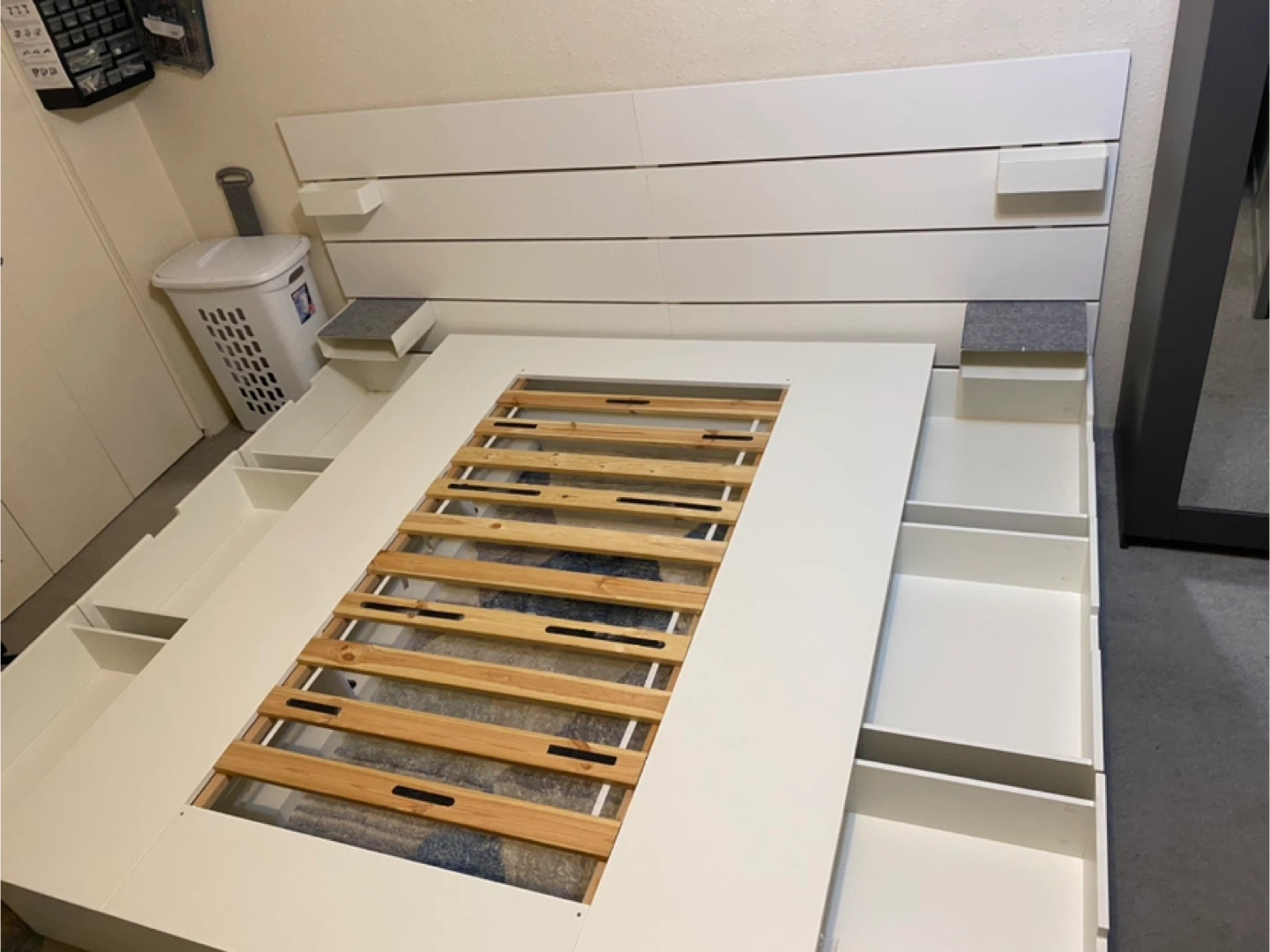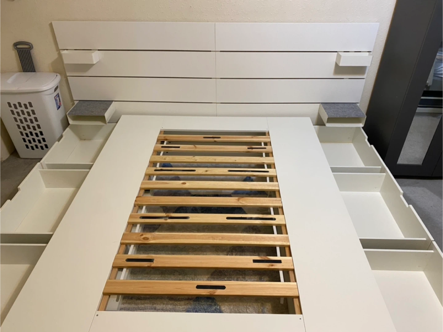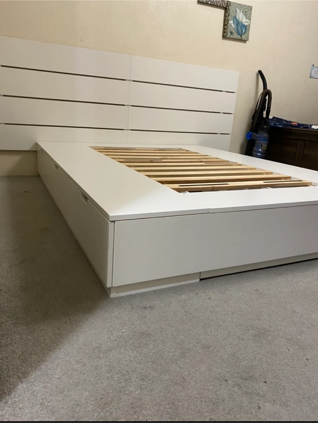 NORDLI queen bed with headboard and 6 hydraulic drawers almost new not a scratch.comes with all parts hardware and guide.pick up near Surrey centre station or can deliver and assemble for extra.