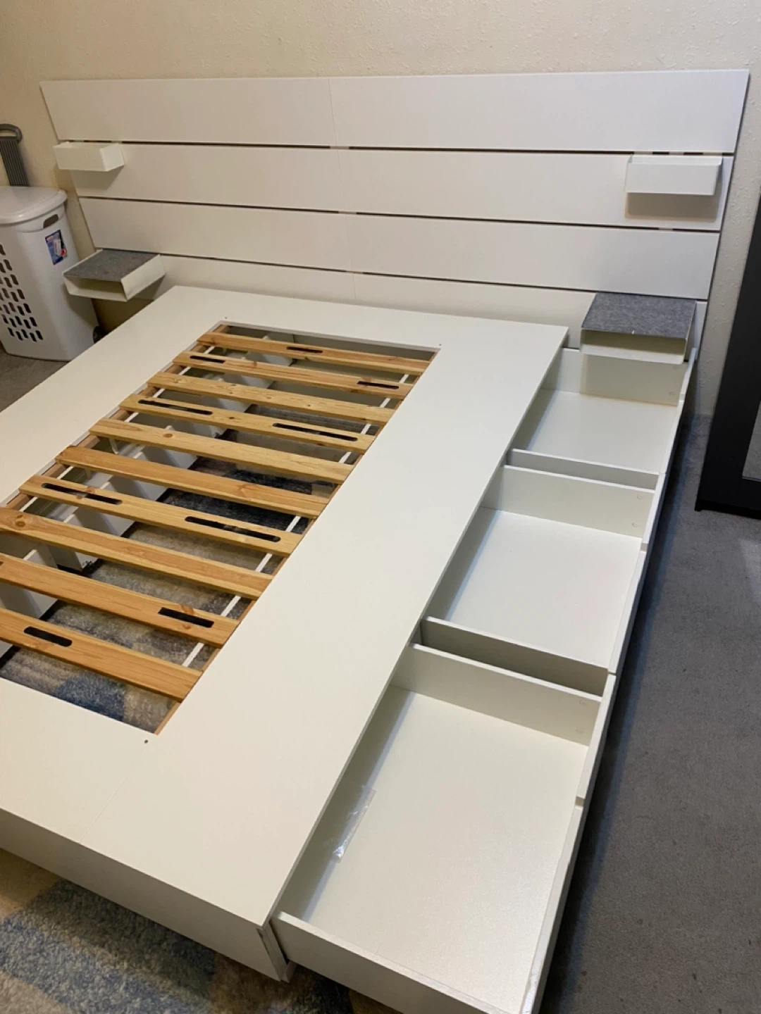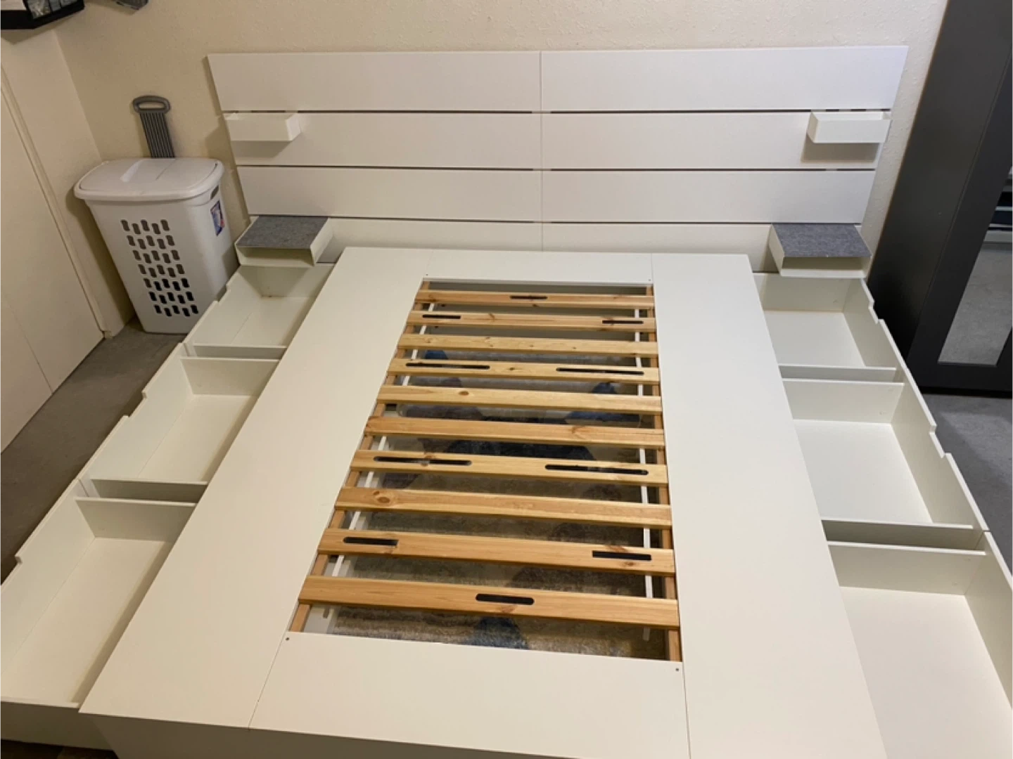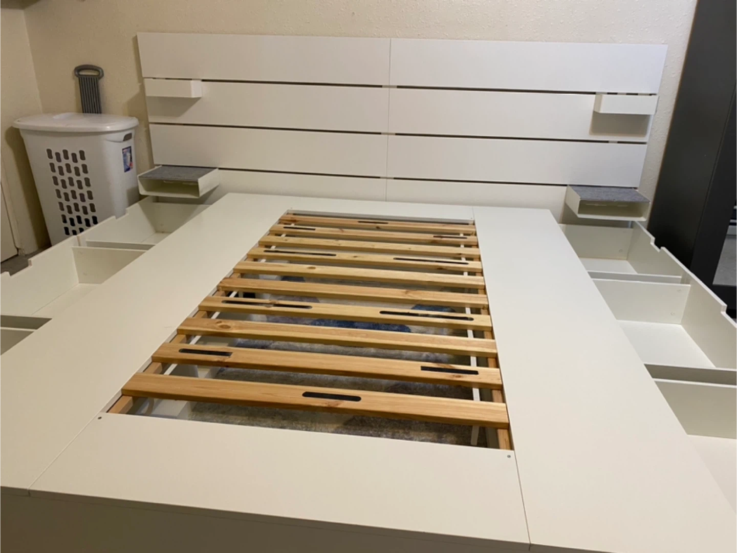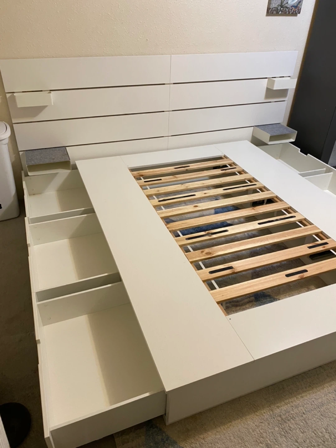 NORDLI queen bed with headboard and 6 hydraulic drawers almost new not a scratch.comes with all parts hardware and guide.pick up near Surrey centre station or can deliver and assemble for extra.