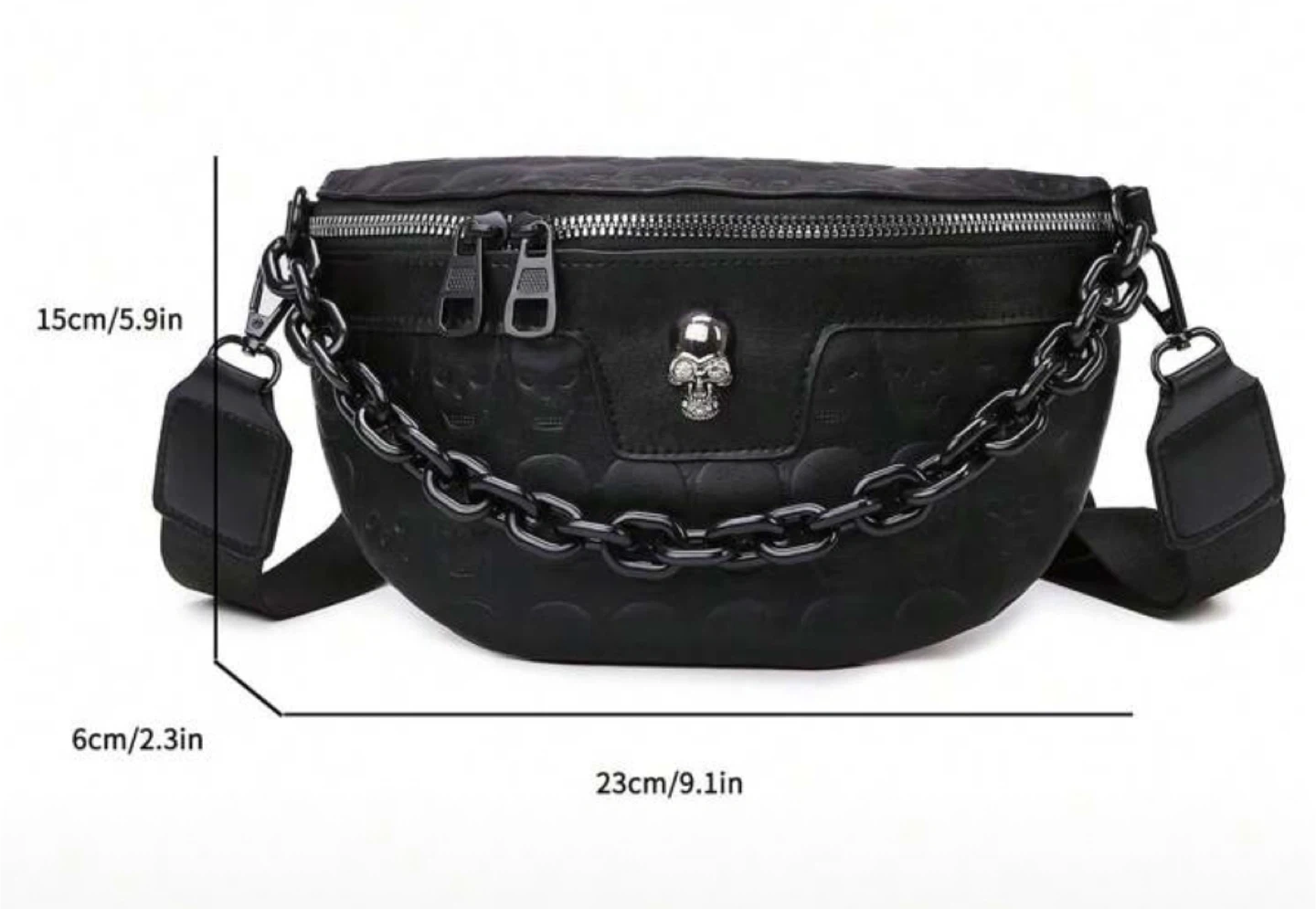 This black belt bag features a unique skull embossed design and a chain detail. It's perfect for adding a bit of edge to your outfit!