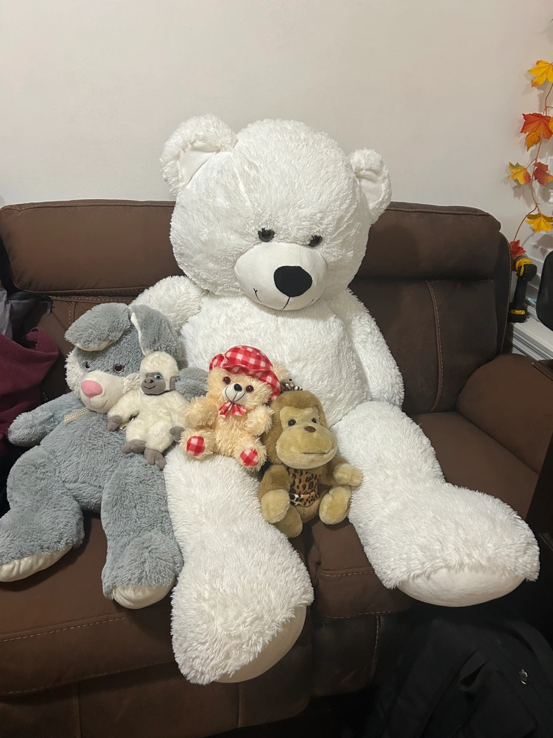 A collection of adorable plush toys looking for a new home! There's a large white teddy bear, a grey bunny, a small sheep, a teddy bear with a red hat, and a monkey