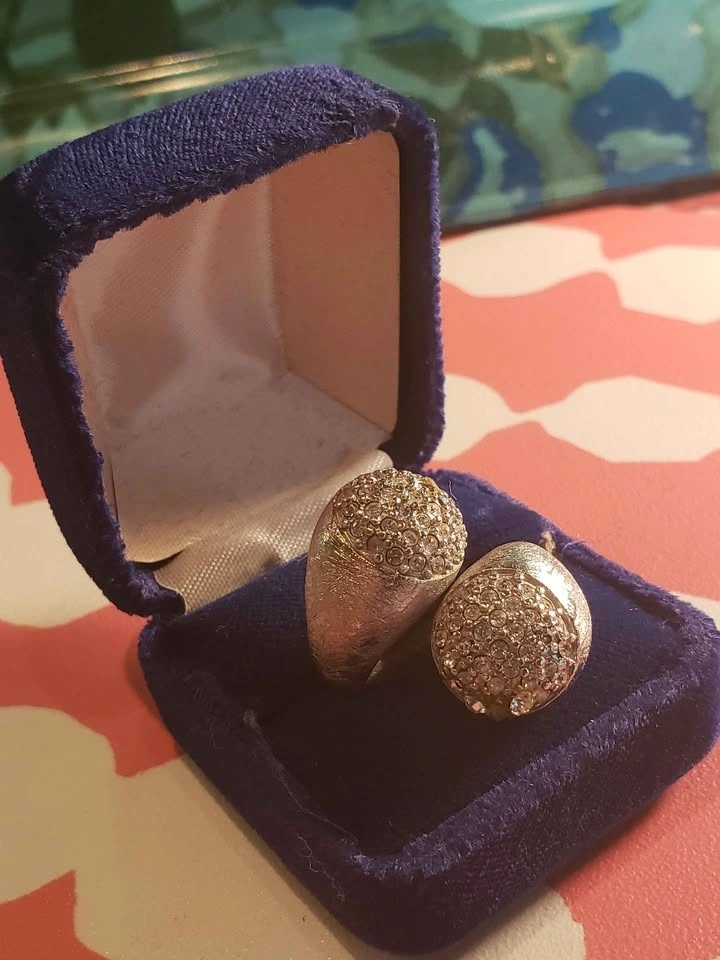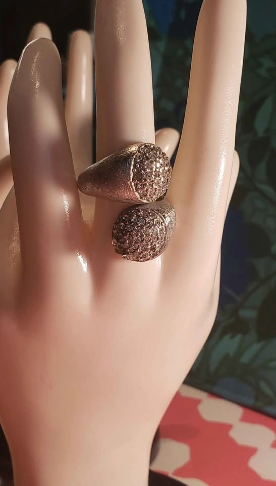 Crystal and silver costume ring purchased ten years ago from a shop that sold handmade jewelry. It's very eye-catching with its wrap-around style and double centers. It is missing a tiny Crystal and has been repaired before so price reflects condition. Ring is adjustable and will fit ring size 10 to 12. Pick up in Upper Lonsdale North Vancouver.