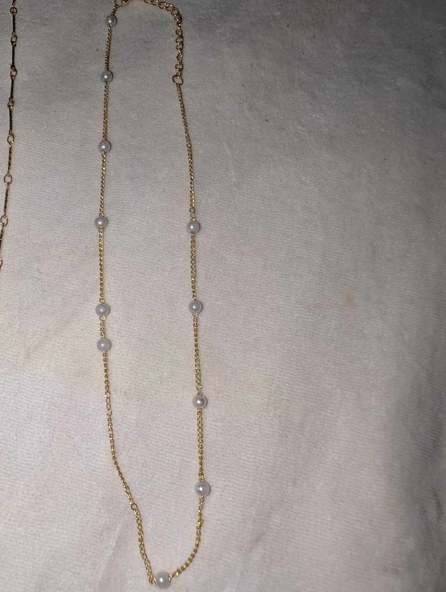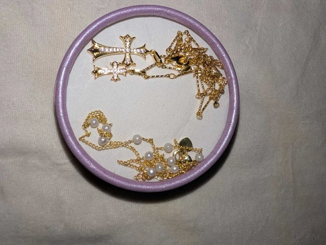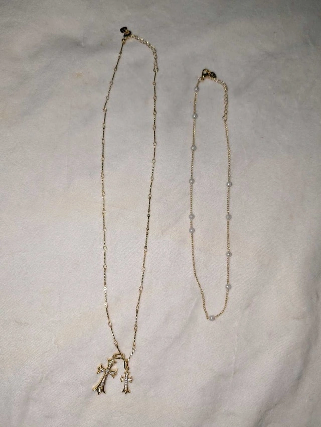 Elevate your style with these pre-loved necklaces, each boasting its unique charm and character. The first is a cross necklace, complete with embedded crystals, which catch the light beautifully. The second is a pearl necklace. They are both very cute. Given the quality, I've priced these slightly above average! If the ad is up, yes, it is still available! Comes with gift box could be used as Christmas gift.