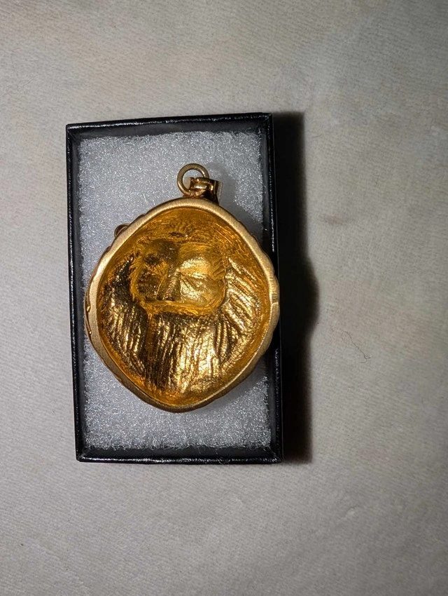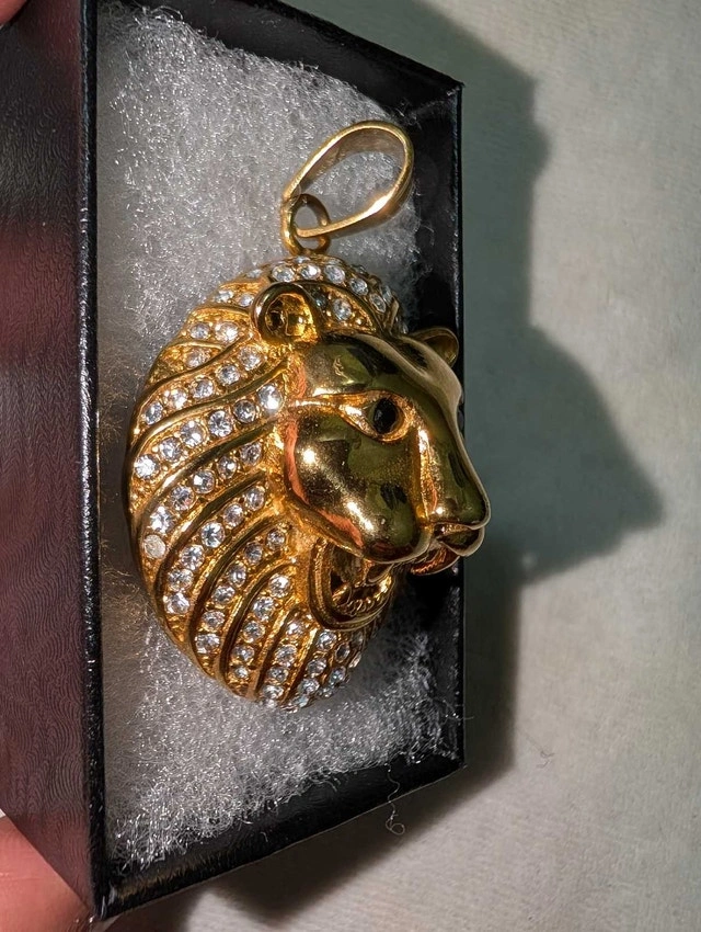 This is a striking lion pendant, intricately detailed with embedded stones, offering a bold statement piece for any jewellery collection. This previously owned pendant is in great condition and ready to roar into your life!