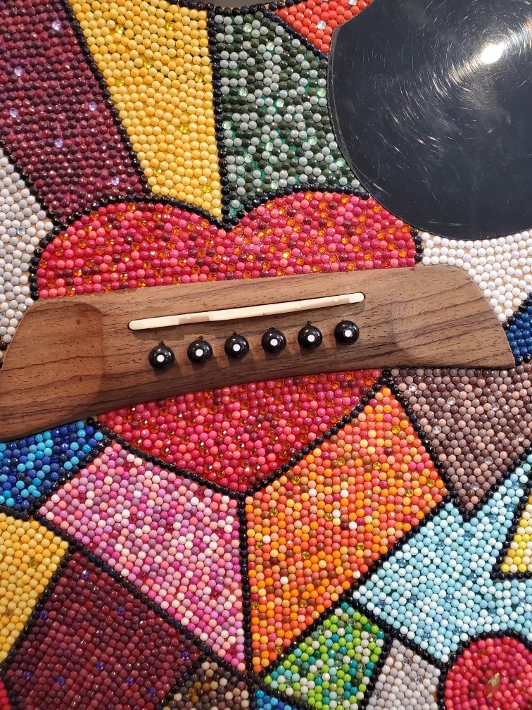 Selling a custom designed guitar from Connie's Memories Forever! This guitar is covered in a mosaic of colourful beads and features heart designs. It's a unique and eye-catching instrument!