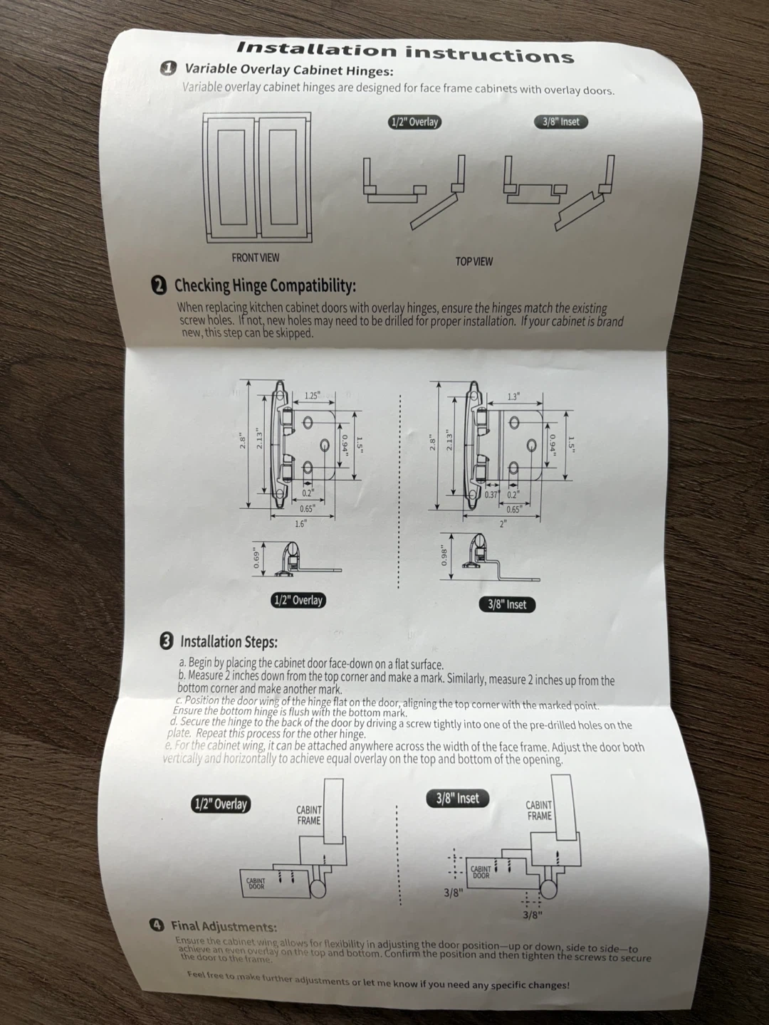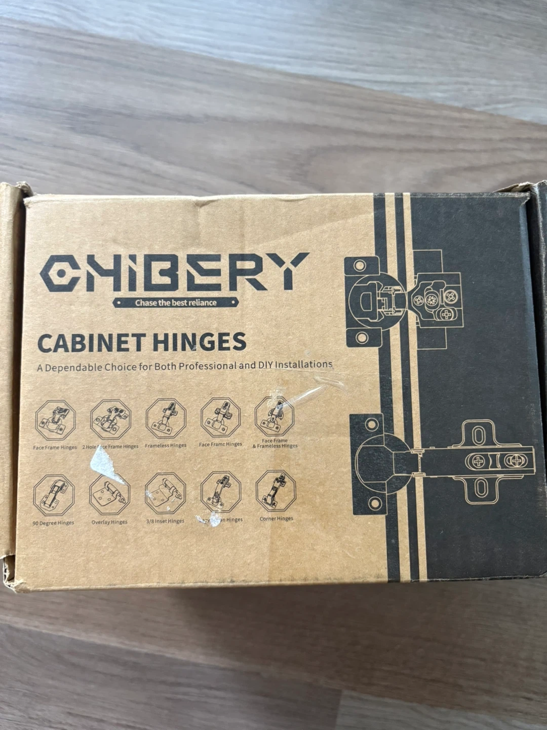 Selling a set of Chiberry cabinet hinges still in their original packaging! These are variable overlay cabinet hinges, suitable for face frame cabinets with overlay doors. Includes installation instructions and all necessary screws for a straightforward DIY installation. A dependable choice for both professional and DIY installations