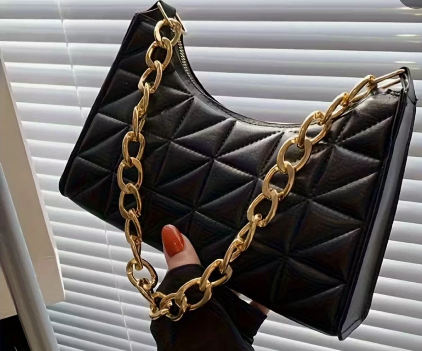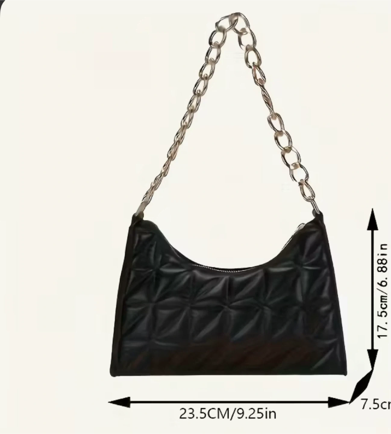 This stylish black quilted shoulder bag features a chunky chain detail. It measures approximately 9.25 inches in length and 6.88 inches in height. Perfect for adding a touch of edginess to any outfit!