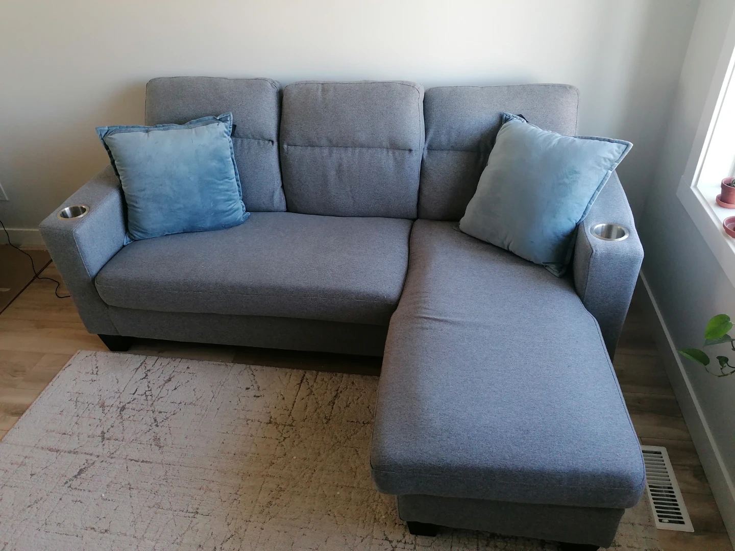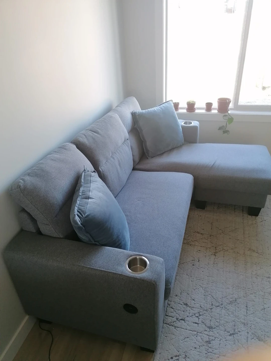 Selling a comfy grey sectional sofa! It's in great shape and features a chaise lounge for extra relaxation. The sofa also includes built-in USB ports, super handy for charging your devices while you chill out