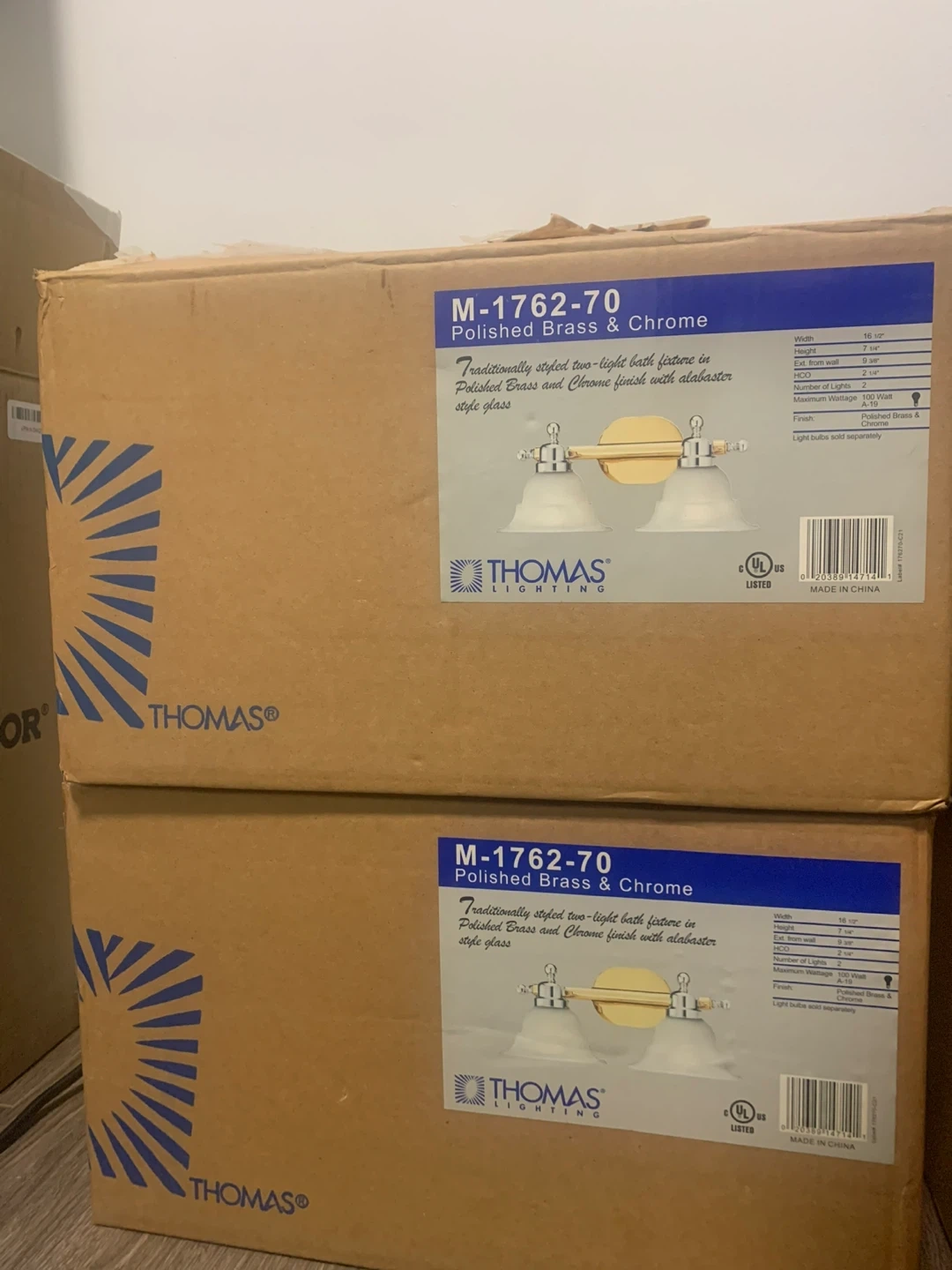 Selling a new Thomas Lighting two-light bath fixture in polished brass and chrome finish with alabaster style glass. It's still in the box with all components and instructions included!