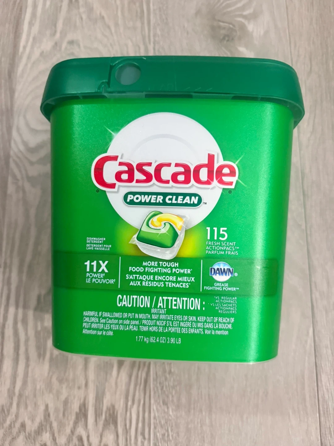 Selling a container of Cascade Power Clean ActionPacs. This container has 115 of the fresh scent pacs. They offer more tough food fighting power and have Dawn grease fighting power. Net weight: 1.77 kg (62.4 oz) 3.90 lb