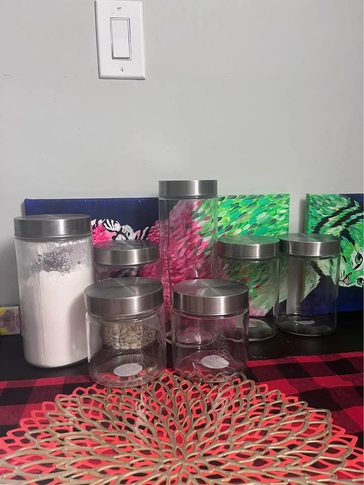 7 Glass canisters, different sizes. Will give empty and cleaned.