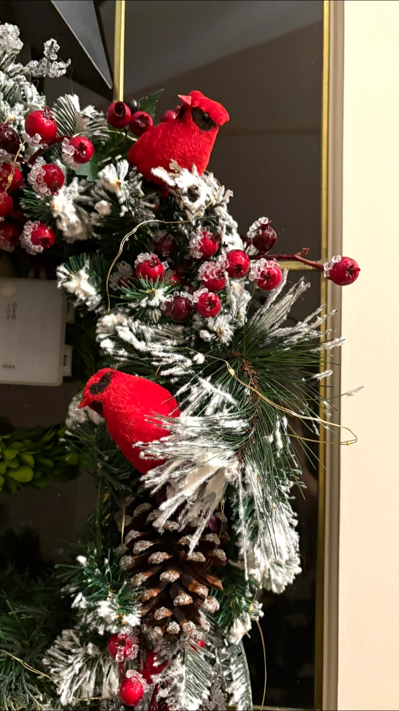 Festive Christmas wreath featuring cardinals, pine cones, and berries!