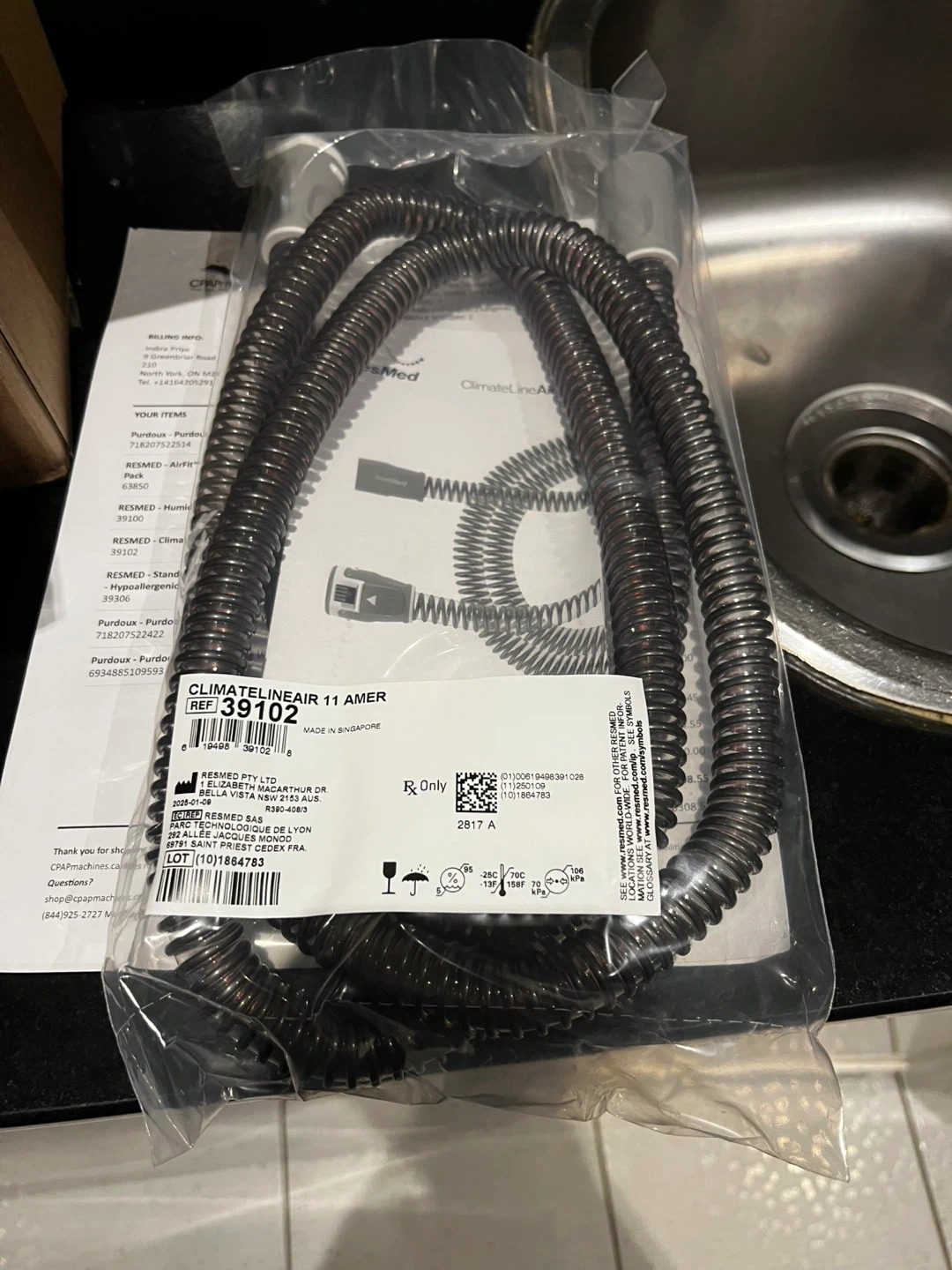 Selling a ResMed ClimateLineAir 11 Amer CPAP tubing. It's still in its original packaging and ready to use. The packaging indicates a manufacturing date of 2025 January 09.
