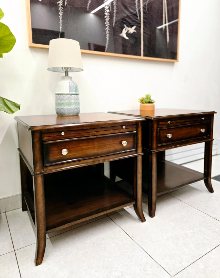Pair Of Solid Walnut Nightstands With Single Drawer And Pullout Tray
