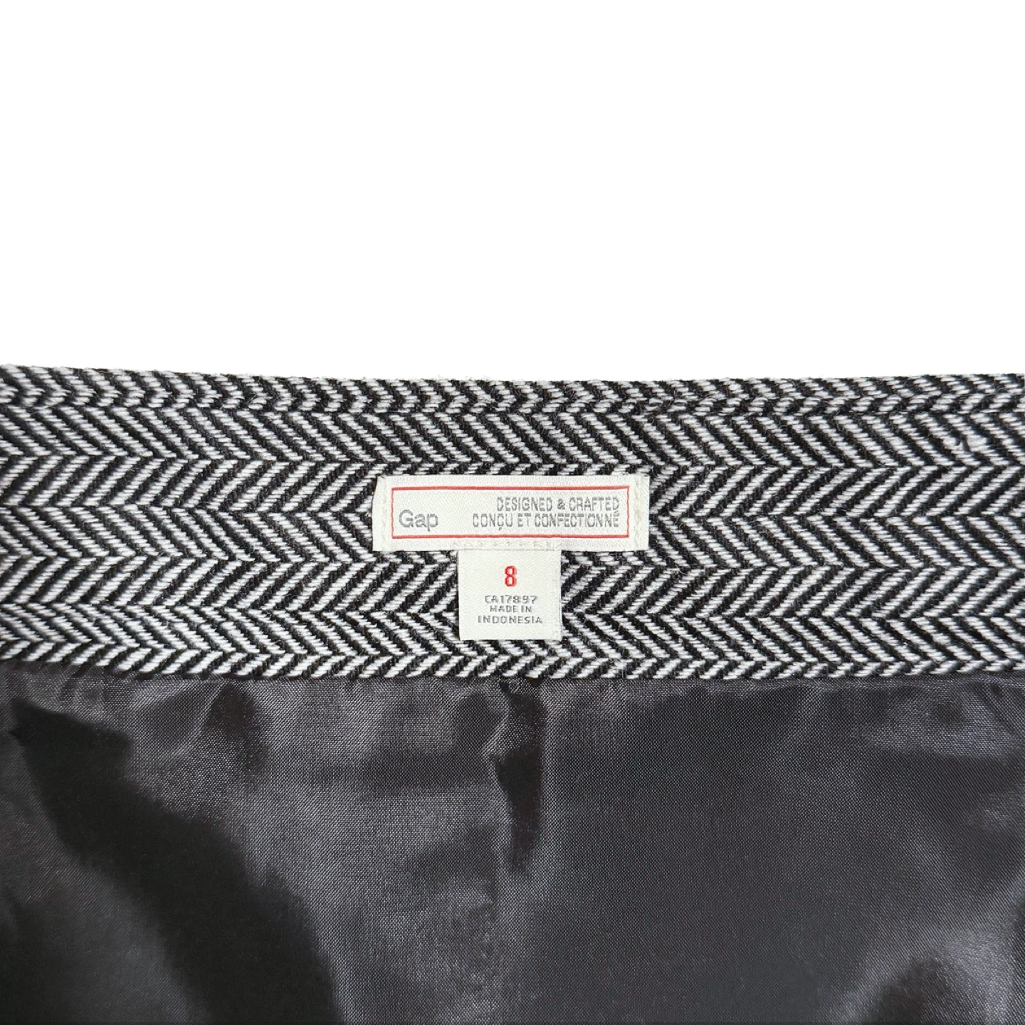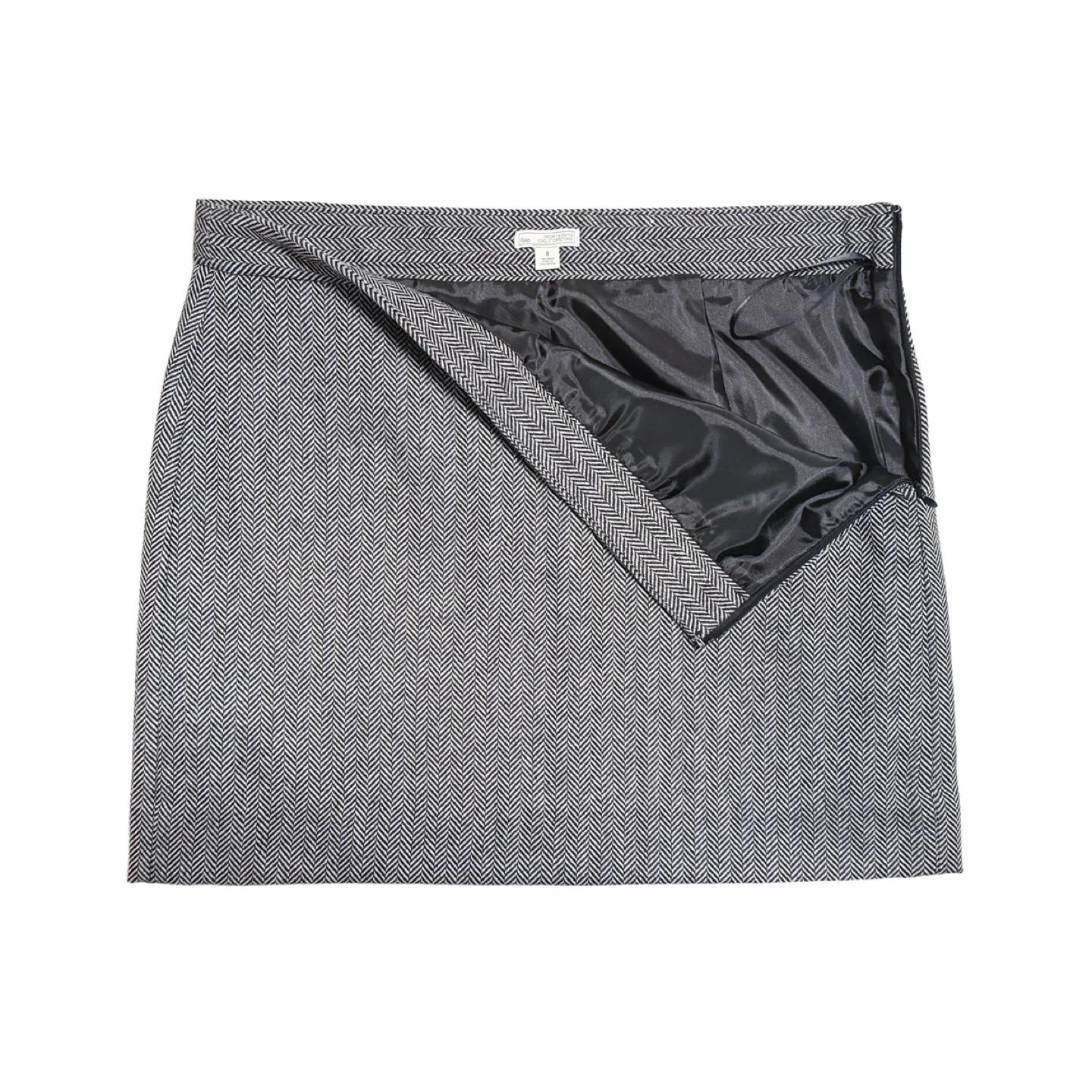 A classic, structured mini skirt by Gap from the fall 2013 collection, featuring a fine herringbone pattern. The skirt is fully lined, has back darts and an invisible side zipper with hook closure. Its straight silhouette and subtle tailored waistband are ideal for pairing with knitwear or crisp shirts.