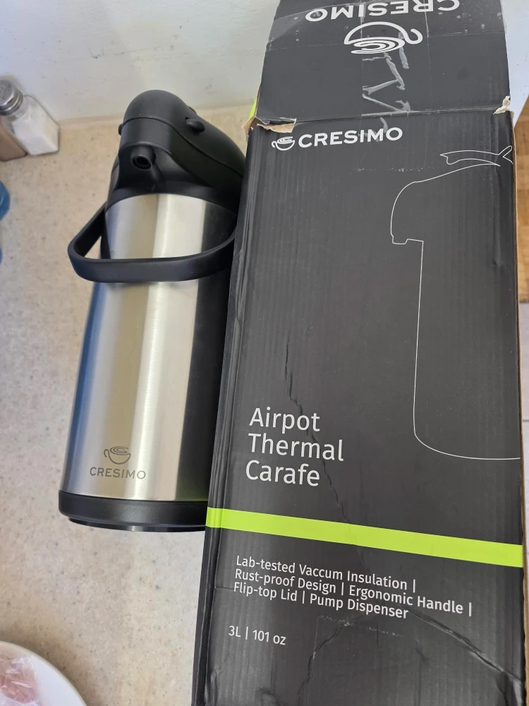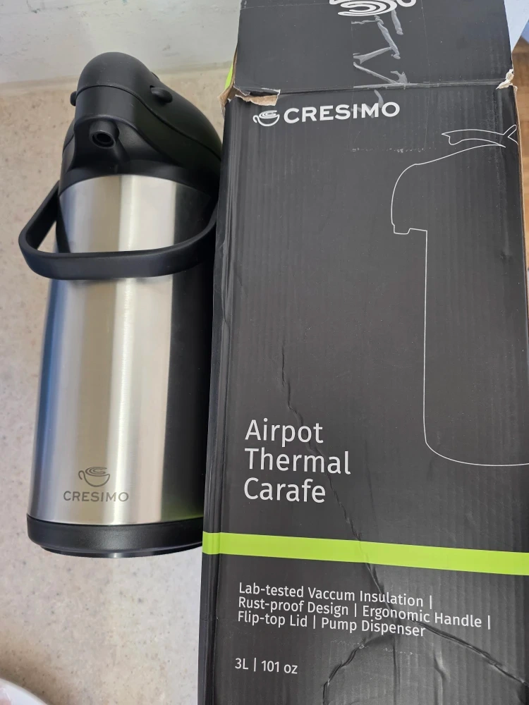 Selling a Cresimo Airpot Thermal Carafe with a 3L capacity! It features lab-tested vacuum insulation, a rust-proof design, an ergonomic handle, and a flip-top lid with a pump dispenser. The box is included