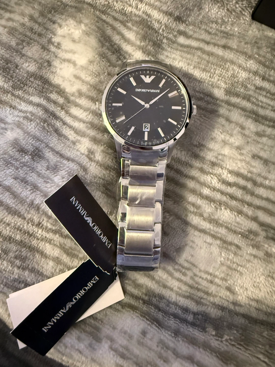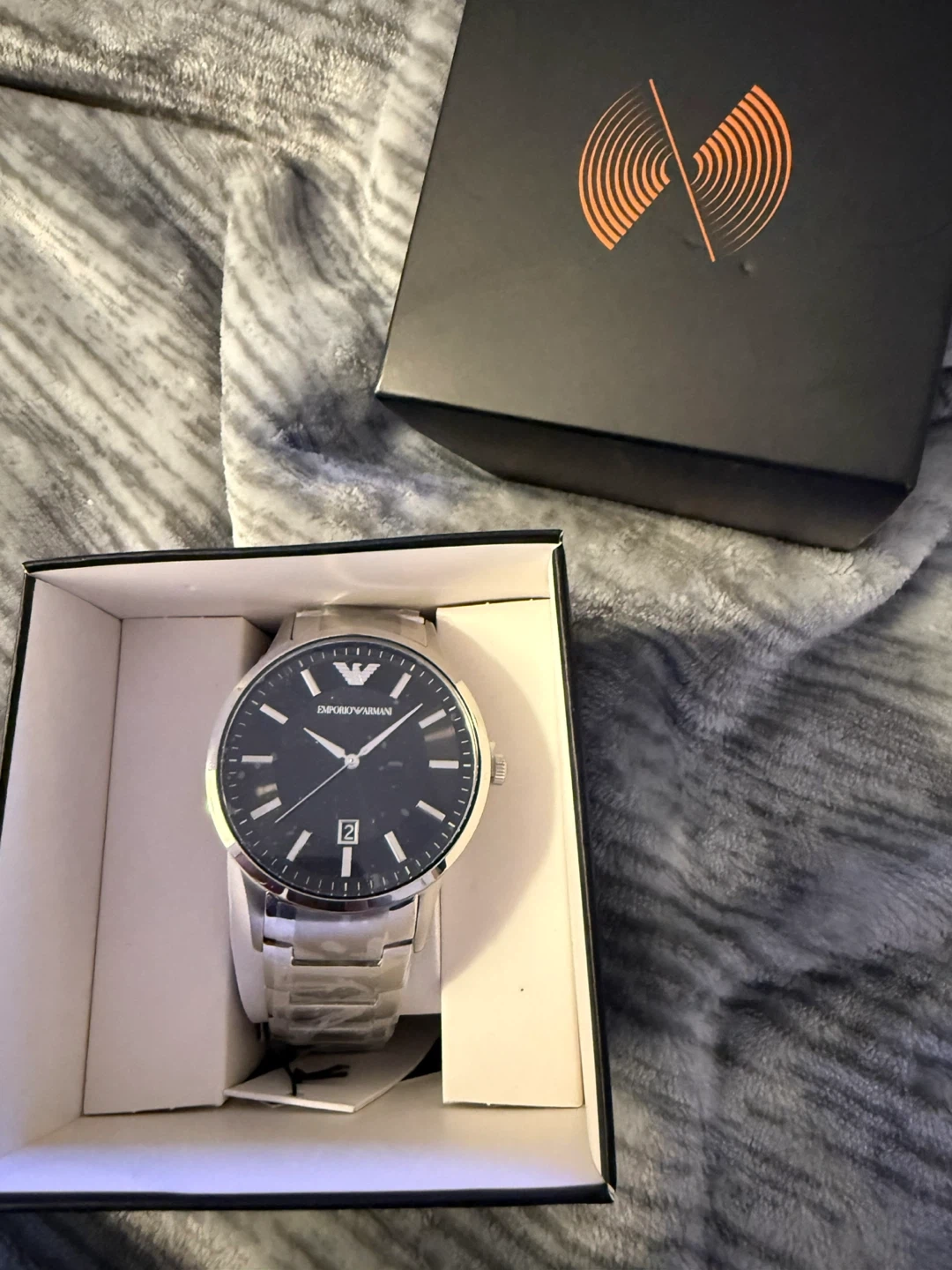 Selling a stylish Emporio Armani men's watch in silver. It's in great condition and comes with the original box. A classic timepiece that's perfect for any occasion. Quartz movement, never used, still intact in original packaging. Price is $365 + taxes.