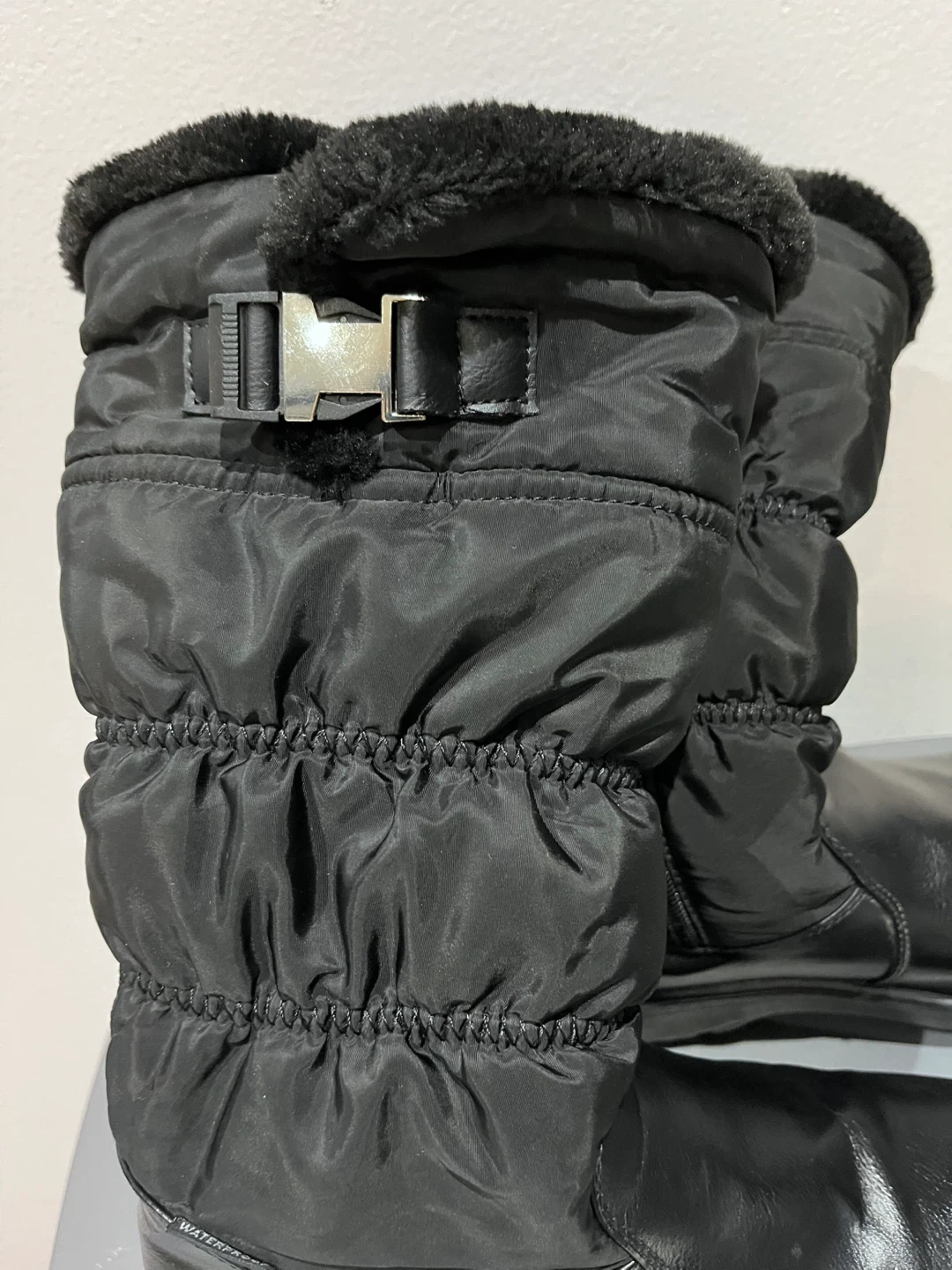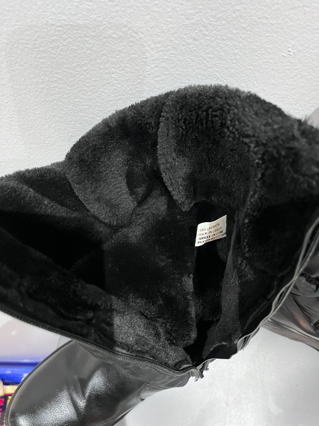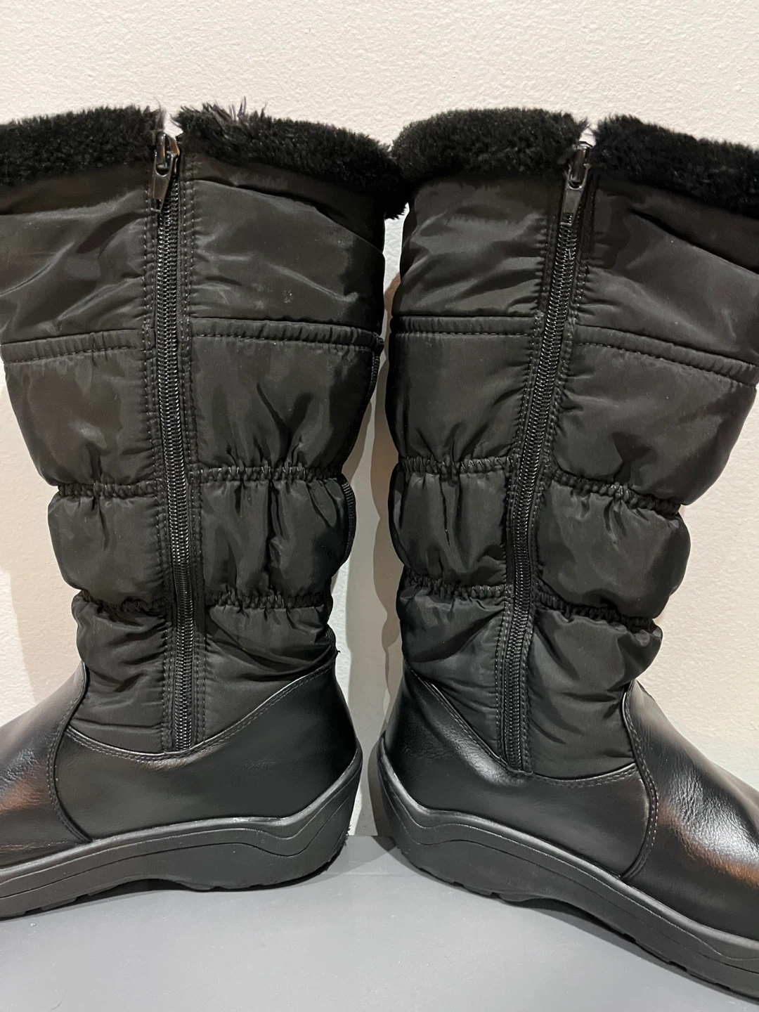 Black winter boots for young girls size 6. They have a waterproof exterior and a cozy faux fur lining. Zip up tall boots. Gently used as the treads are still in good shape. They stand 13” tall.