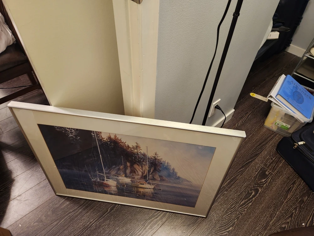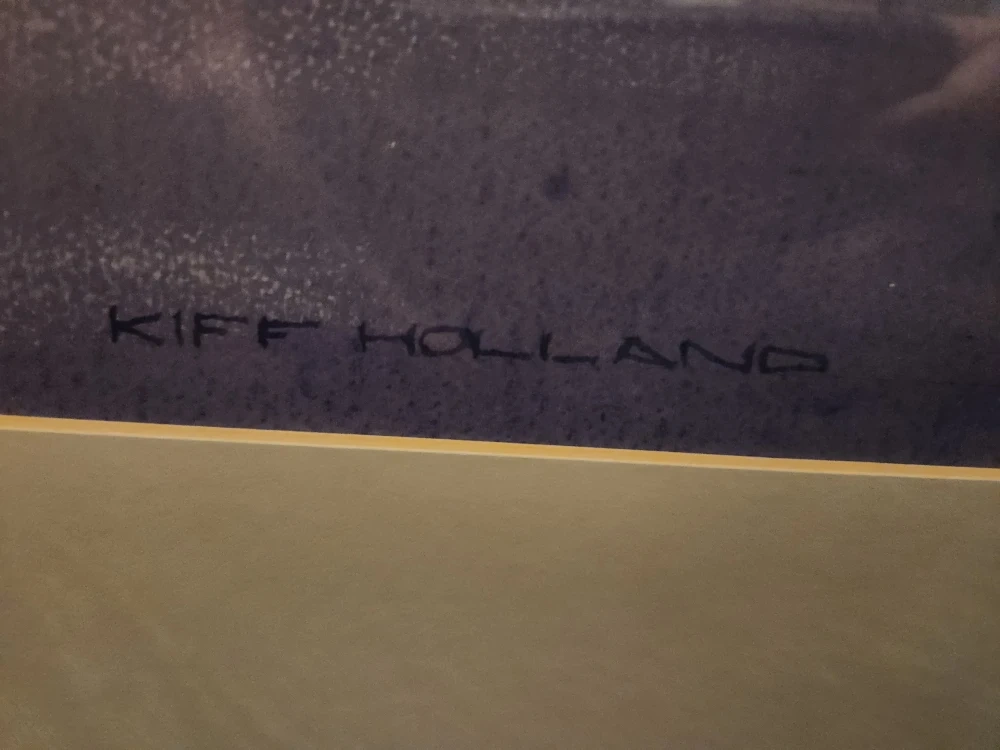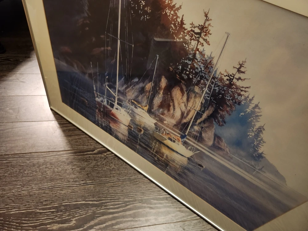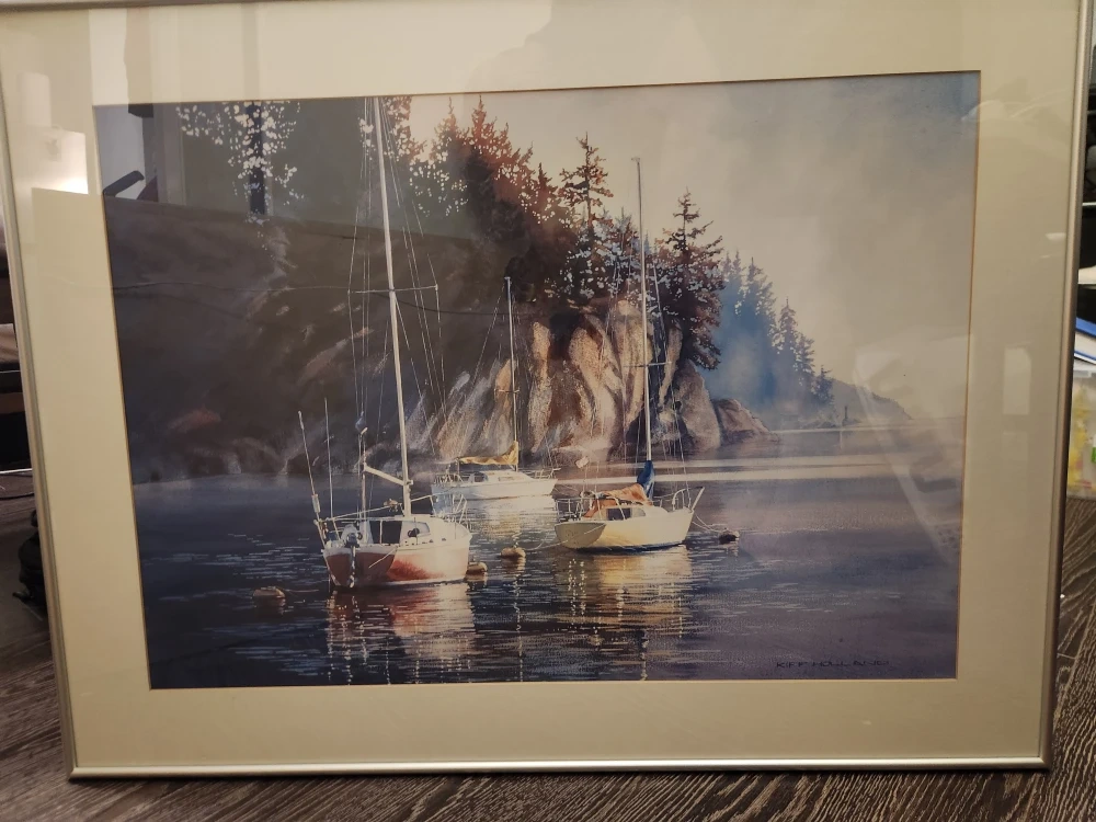 Selling a framed art print by Kiff Holland. The print features a beautiful scene with sailboats on the water. It's in great condition and ready to be hung in your home! 33 inches x 20 inches. Weighs 10 lbs.