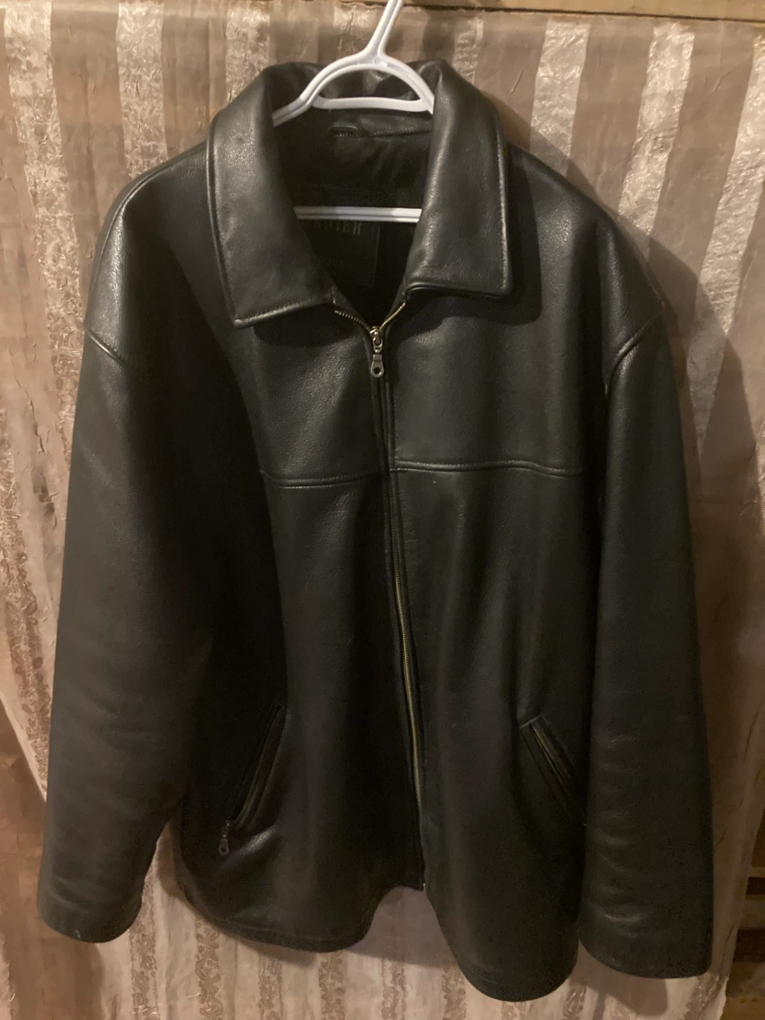 Here's a classic black leather jacket, perfect for adding a bit of edge to any outfit! It's in great condition and ready for a new home