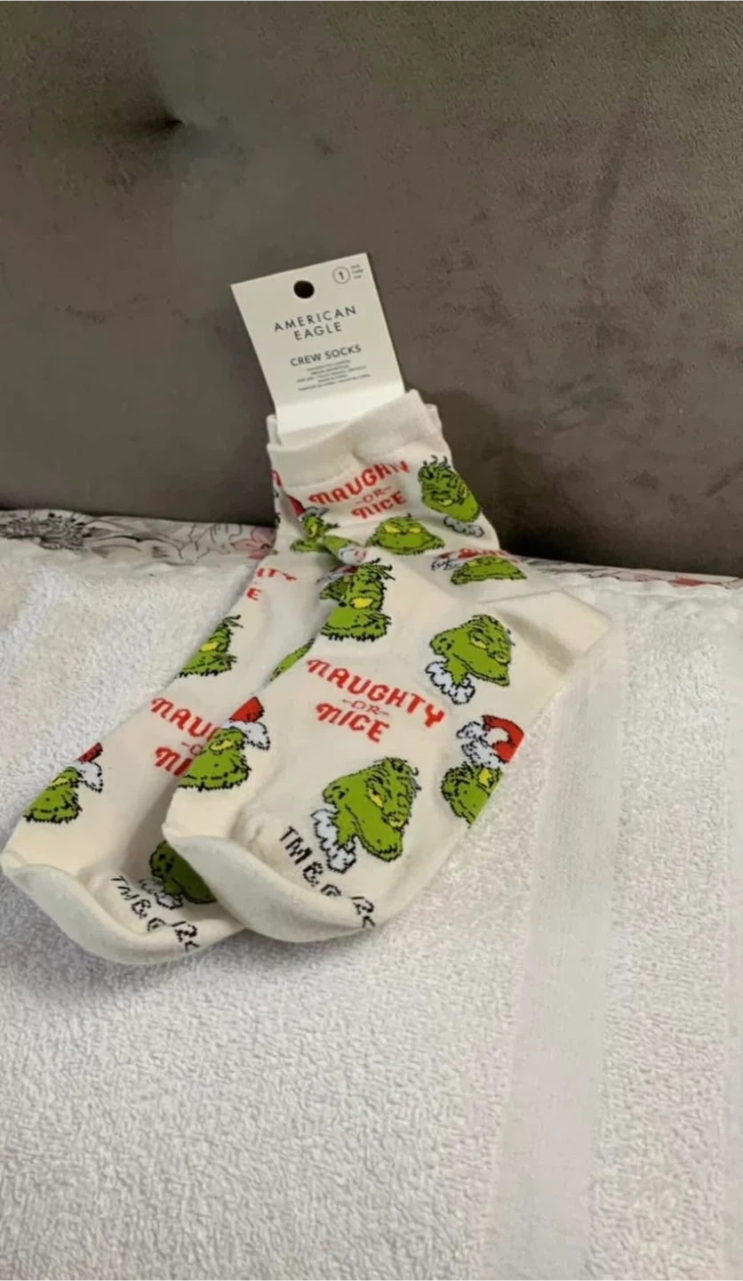 These American Eagle crew socks feature a fun Grinch design. They're perfect for adding a bit of holiday cheer to your outfit!