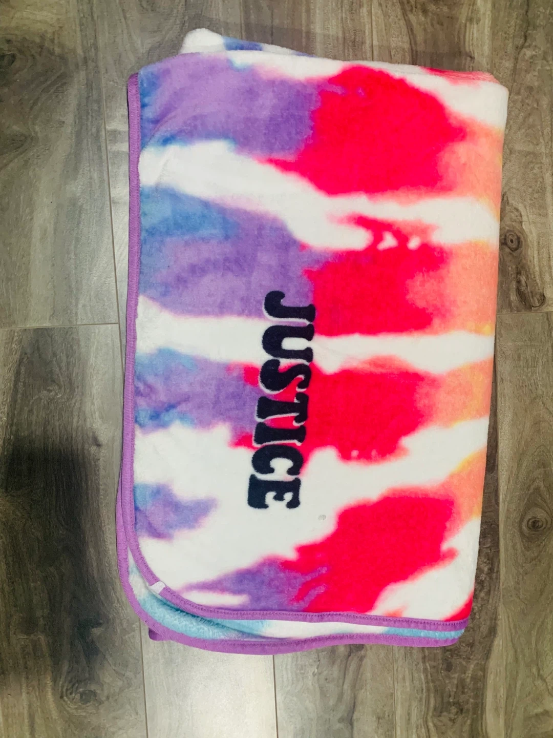 Cozy Justice tie-dye plush blanket in great condition! Perfect for adding a pop of colour to any room or for snuggling up on the couch. The vibrant tie-dye design features a mix of fun colours.