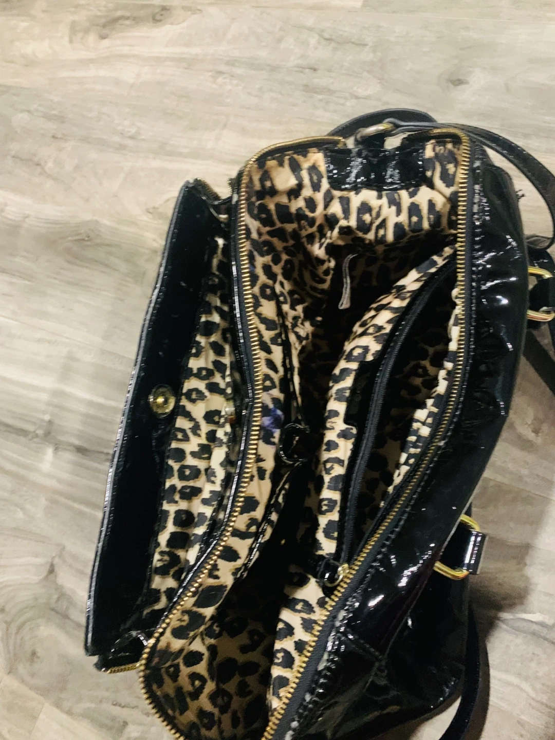 Selling a stylish black patent leather handbag. It features a fun leopard print lining and gold-tone hardware. Perfect for adding a touch of chic to any outfit!