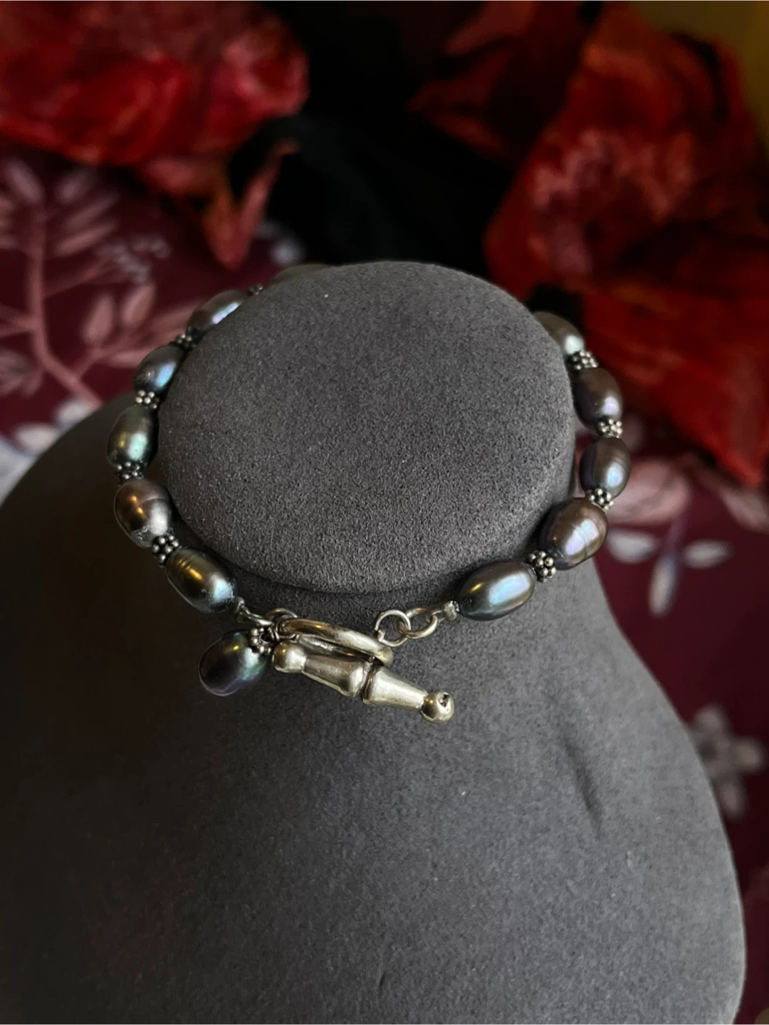 Beautiful pearl bracelet with a unique toggle clasp and silver accents. It's in great condition and ready to add a touch of elegance to any outfit
