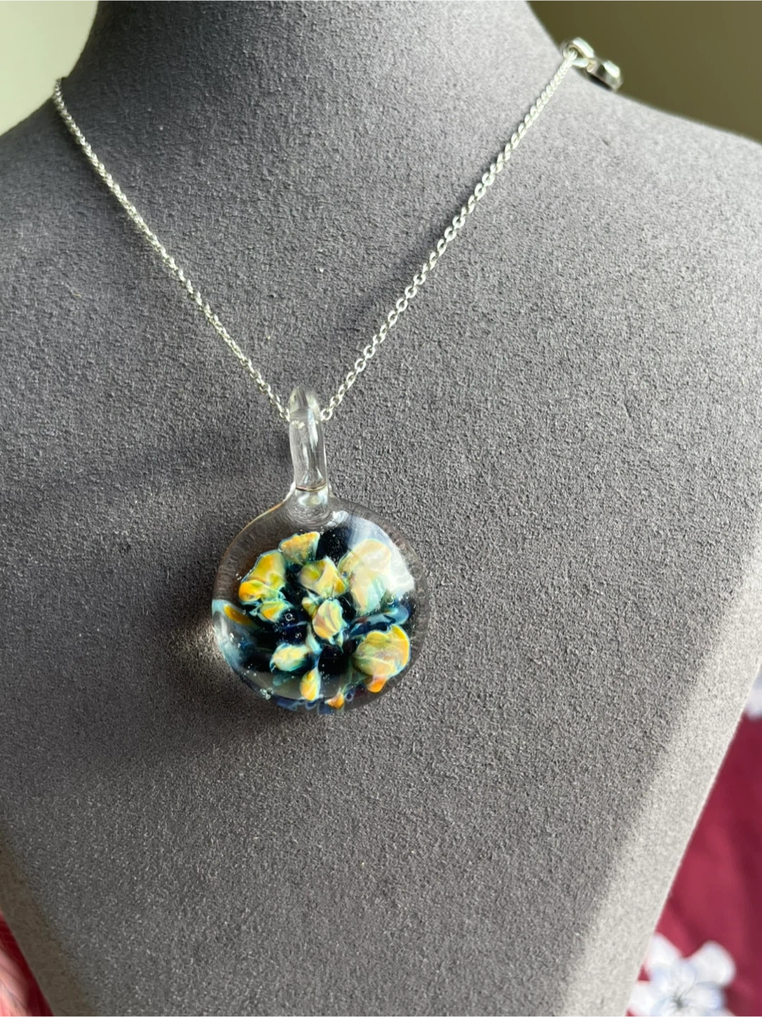 Selling a unique, handmade glass pendant necklace! The pendant features a beautiful array of colours encased in clear glass, suspended from a delicate silver-tone chain. It's a lovely piece to add a touch of artistry to any outfit