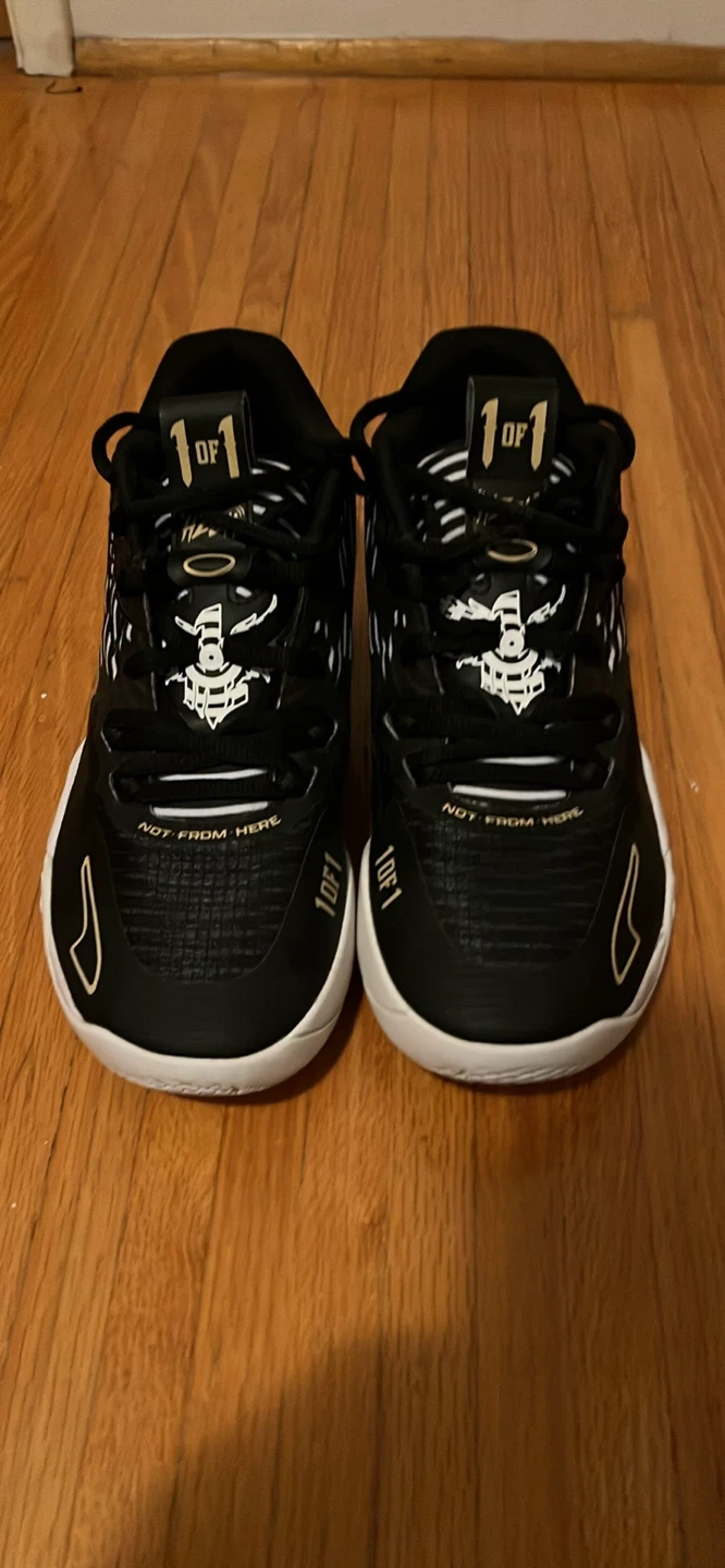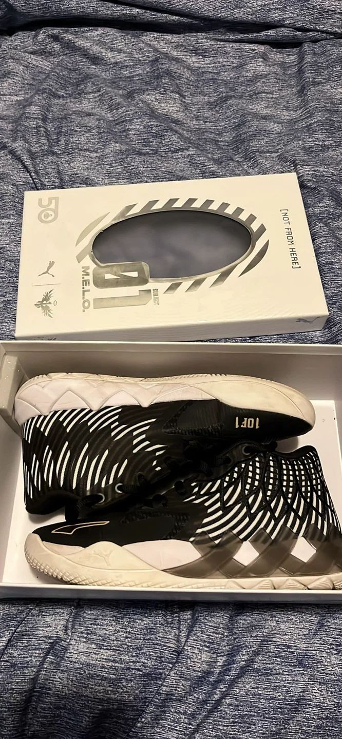 Selling a pair of Puma MB.01 Melo 1 of 1 basketball shoes! These are in great condition and come with the original box. The shoes feature a unique black and white design with gold accents. Perfect for basketball or other indoor sports.