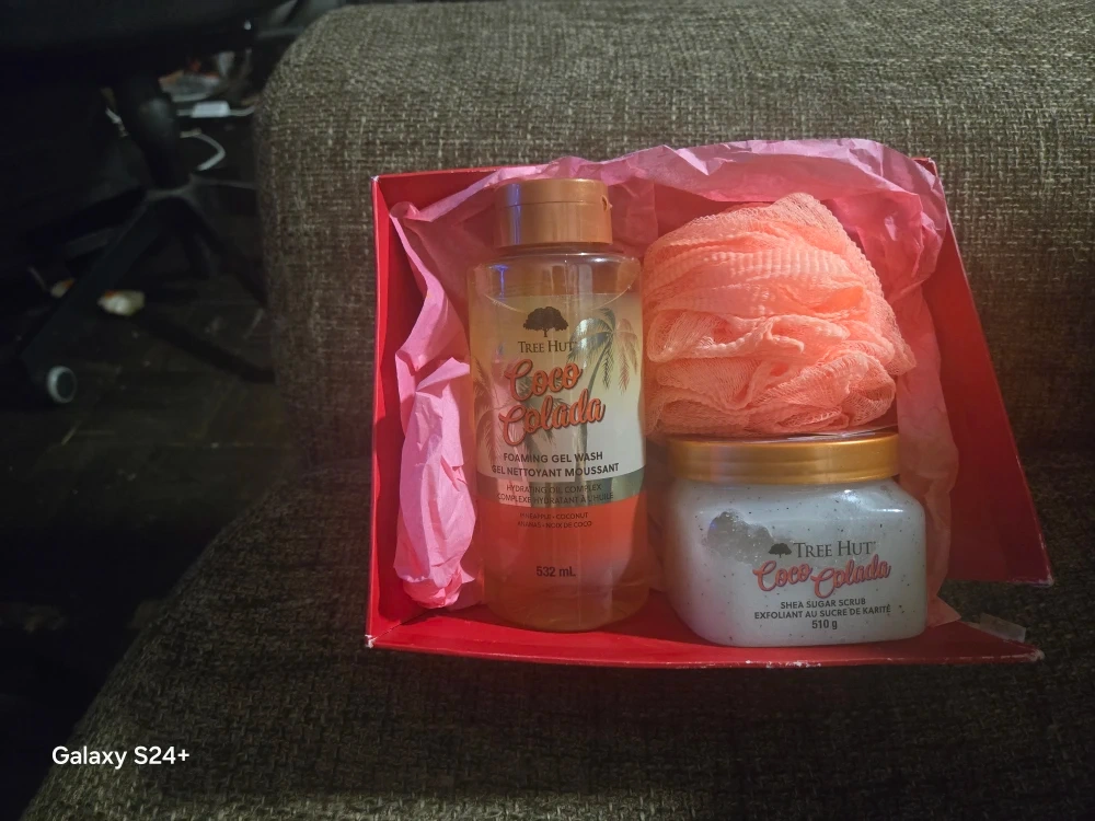 Selling a Tree Hut Coco Colada gift set! It includes a foaming gel wash (532 mL), shea sugar scrub (510 g), and a bath pouf. Perfect for a little self-care