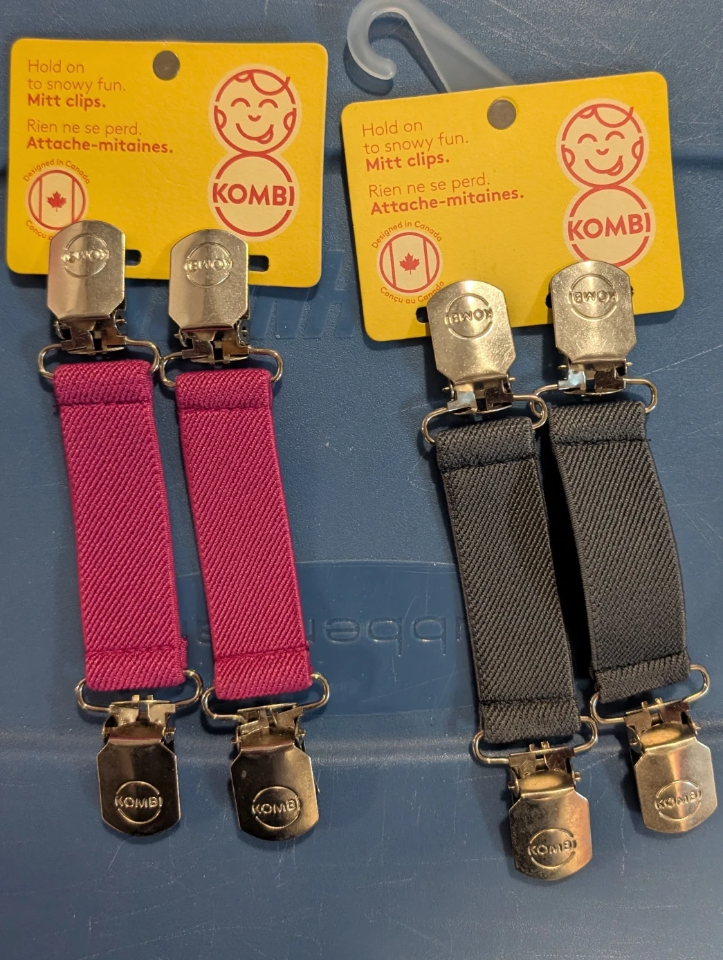 Keep those mittens safe and sound with these Kombi mitt clips! You'll get one pair in fuchsia and one in grey. Originally bought for $8 each, these mitt savers are designed in Canada