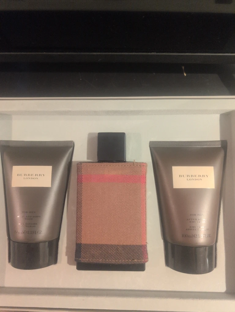 Selling a Burberry London for Men gift set. The set includes a 100ml bottle of hair and body wash, a 100ml bottle of after shave emulsion, and a 100ml bottle of cologne. It comes in its original box, perfect as a gift!