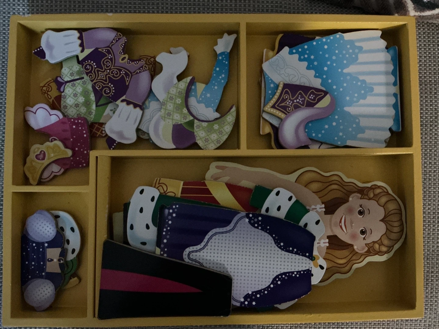 A fun wooden magnetic dress-up set by Melissa & Doug! It comes with lots of different outfits and accessories to mix and match. Great for creative play and developing fine motor skills