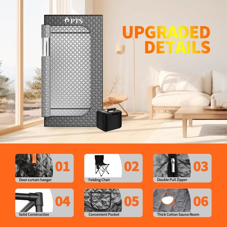 36"*36"*71" Full Size Sauna】The widened full size steam sauna room can easily accommodate two adults. You can stand or sit in it. If you'd prefer to sit, we provide a waterproof folding chair for added comfort, with the chair supporting over 440 pounds. Providing you with a spacious and comfortable experience