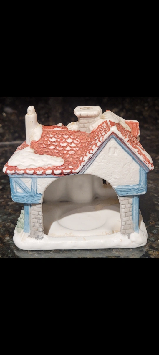 This is a charming ceramic candle holder shaped like a village house! It has a cute, vintage look with a red roof and snowy details. Perfect for adding a cozy touch to your home decor
