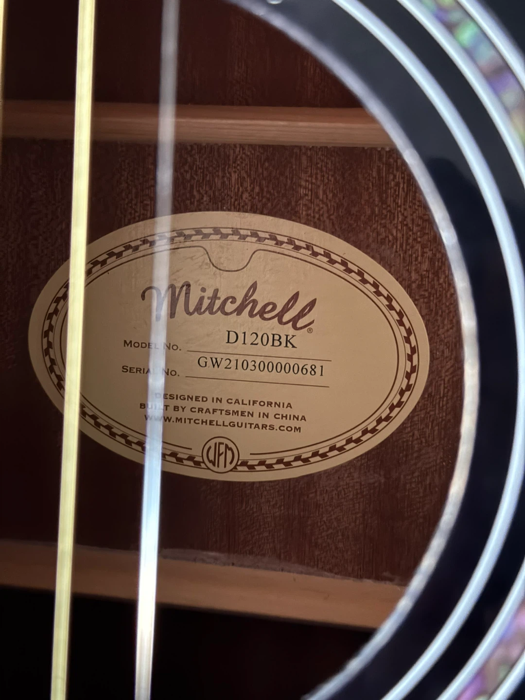 Selling a Mitchell D120BK acoustic guitar in black! It's in great condition and ready for a new owner. This guitar is designed in California and crafted in China. Comes with a case for easy transport and storage. Perfect for beginners or experienced players looking for a reliable instrument