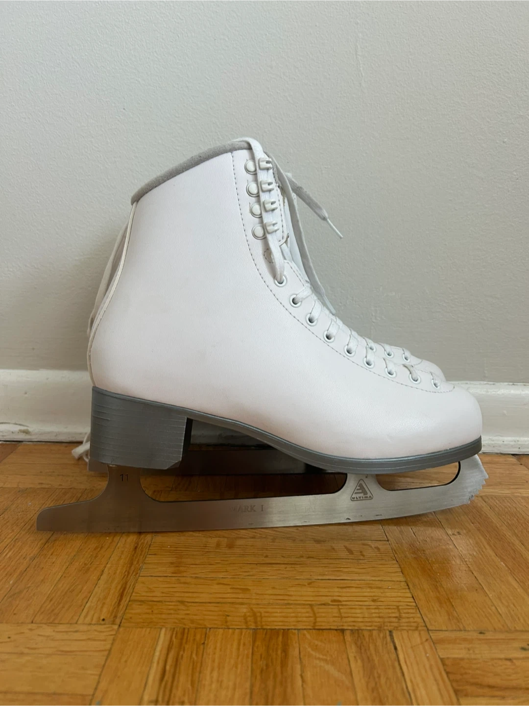 Selling a pair of Jackson figure skates in great shape! They're white and are a size 10. The blades are Ultima Mark I. Perfect for anyone looking to glide on the ice. Slight marks from general use and a bit of colour transference on the inside from pants. The skates are very stable with excellent ankle support. Especially good for casual, beginner, up to intermediate skaters.
